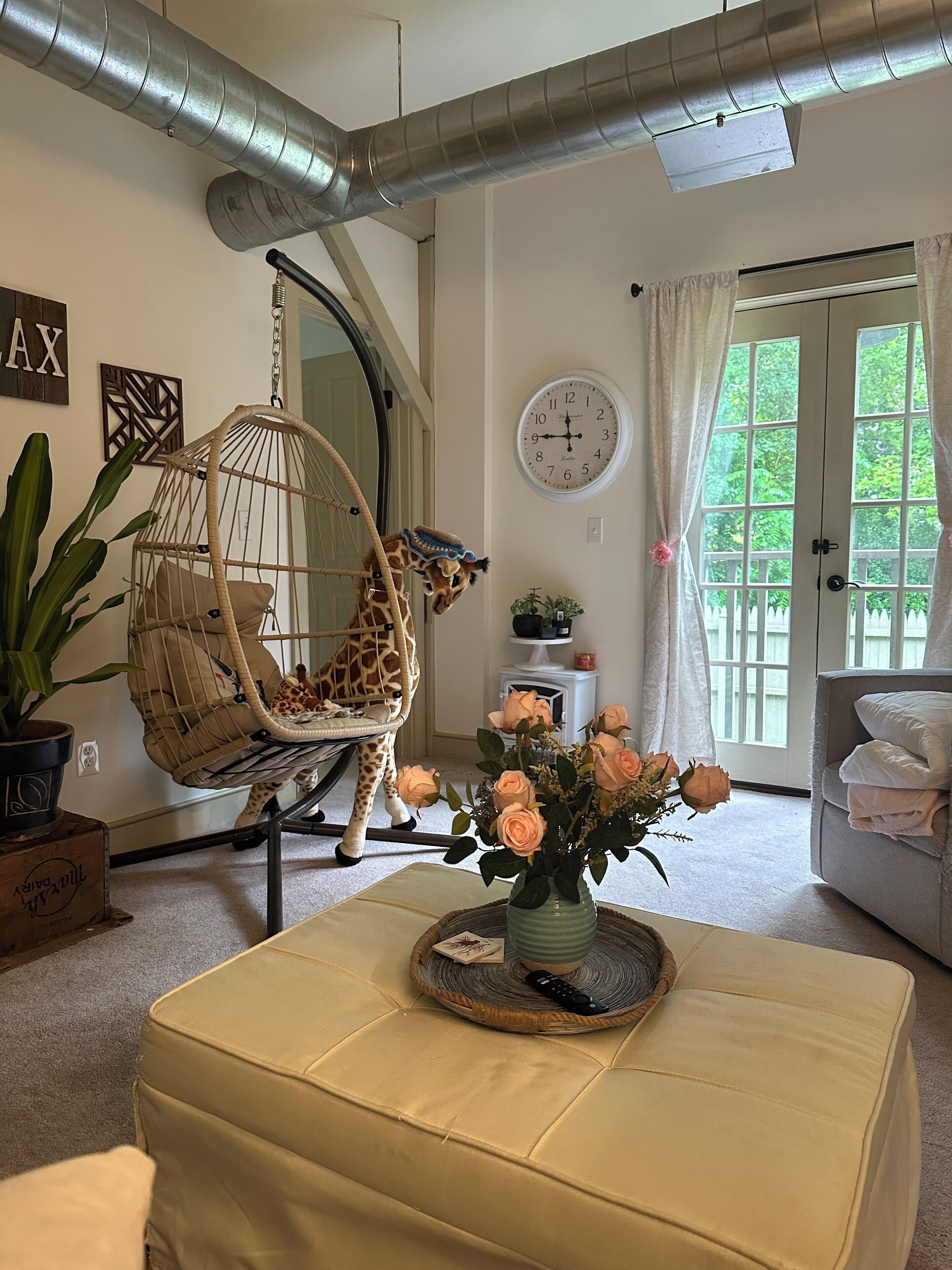 The living room welcomes you with comfortable seating surrounding a beautiful live edge coffee table crafted by a local artist. A 40” Smart TV (Roku) is wall mounted with an arm for optimal viewing angles. Bring your passwords for your streaming subscription for best selections. A ceiling fan is above for added comfort.