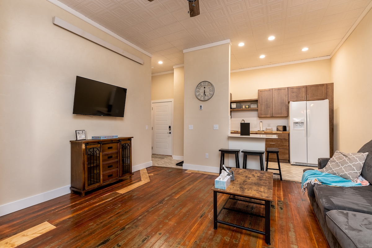 Couch, compact oven and fridge, Keurig, Toaster, Free Wi-Fi, basic kitchen essentials for cooking (ask for more details if you have specific needs!).