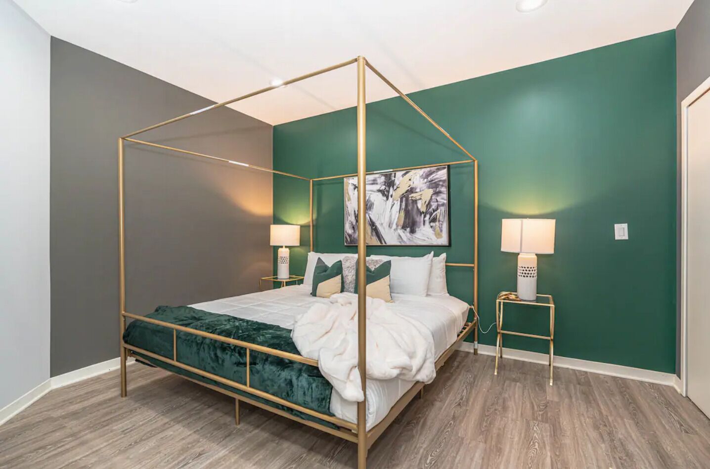 It features beautiful furniture throughout, including a modern queen bed standing on beautiful matte hardwood flooring adorned by classic pieces of decor throughout. Also, a smart high definition television resting upon a beautiful contemporary stand with intrinsic storage to fulfill the most fastidious of your viewing and lounging wants and needs.
