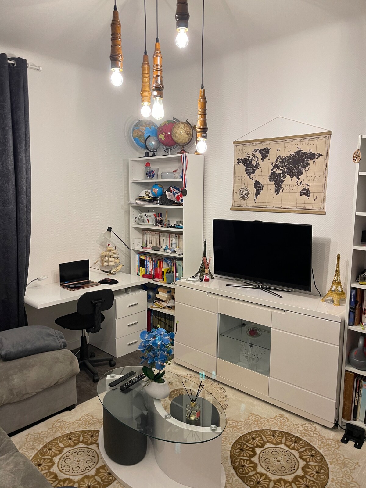 The living room consists of a high-end sofa bed for 2 people (140), a low table lift for indoor meals with 4 chairs (comfortable), a living room with two wardrobes, a Bluetooth speaker and TV.
