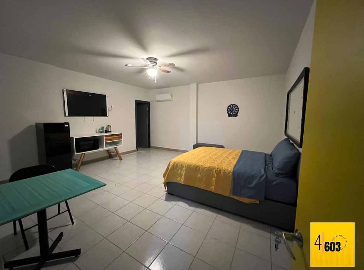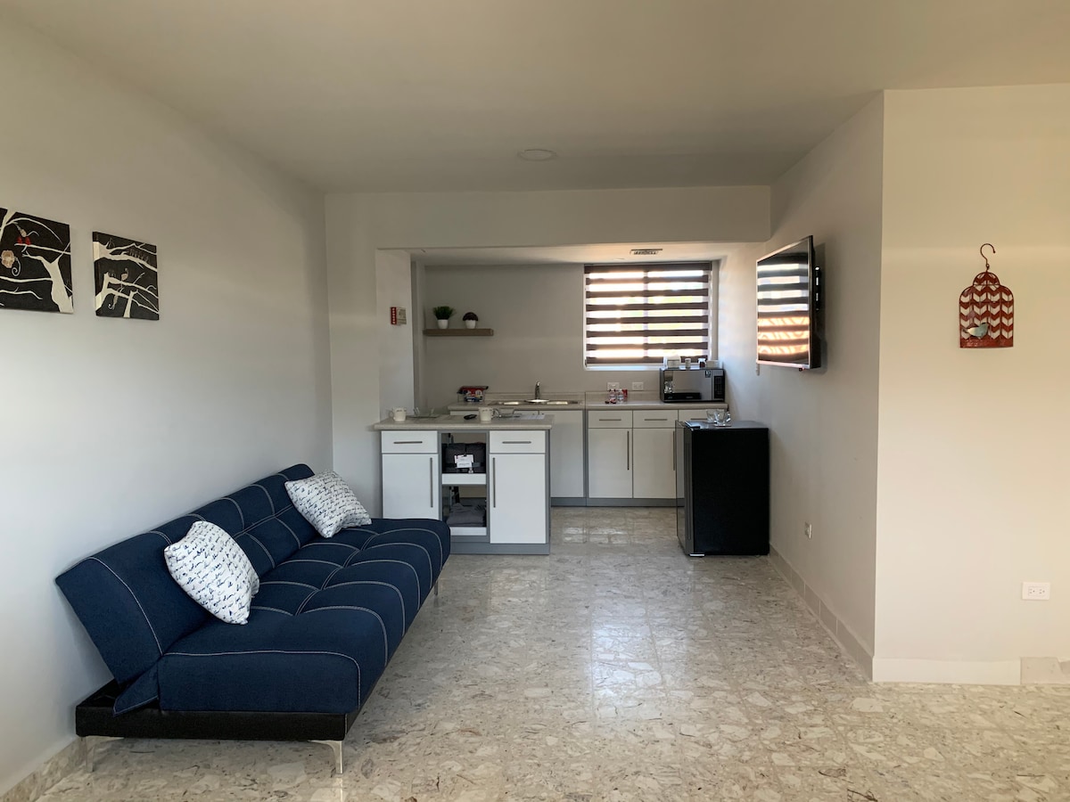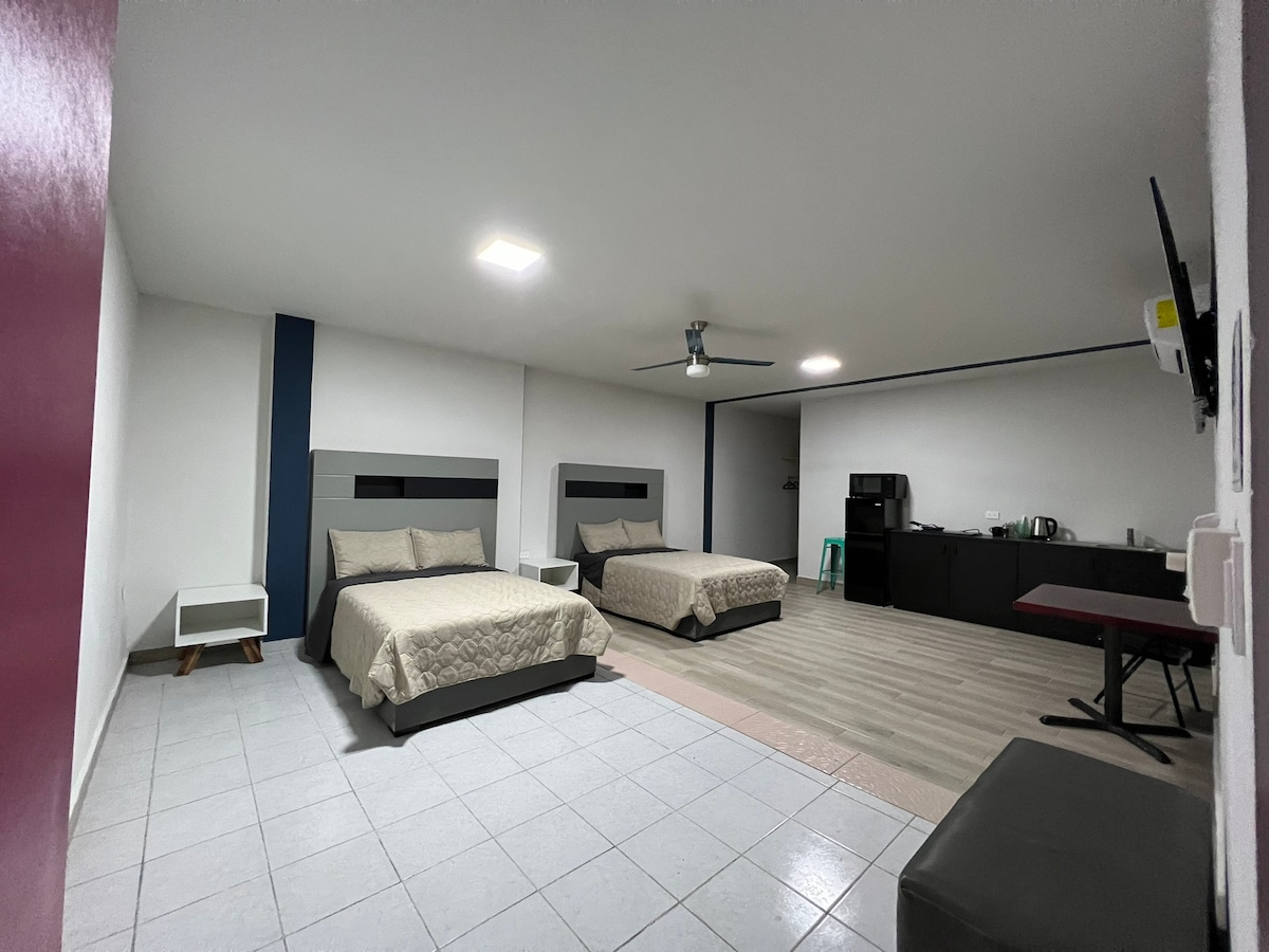 Comfortable studio with 2 double beds, Wi-Fi, Netflix, 50-inch TV, hot and cold mini-split, hair dryer, clothes iron, refrigerator, and microwave