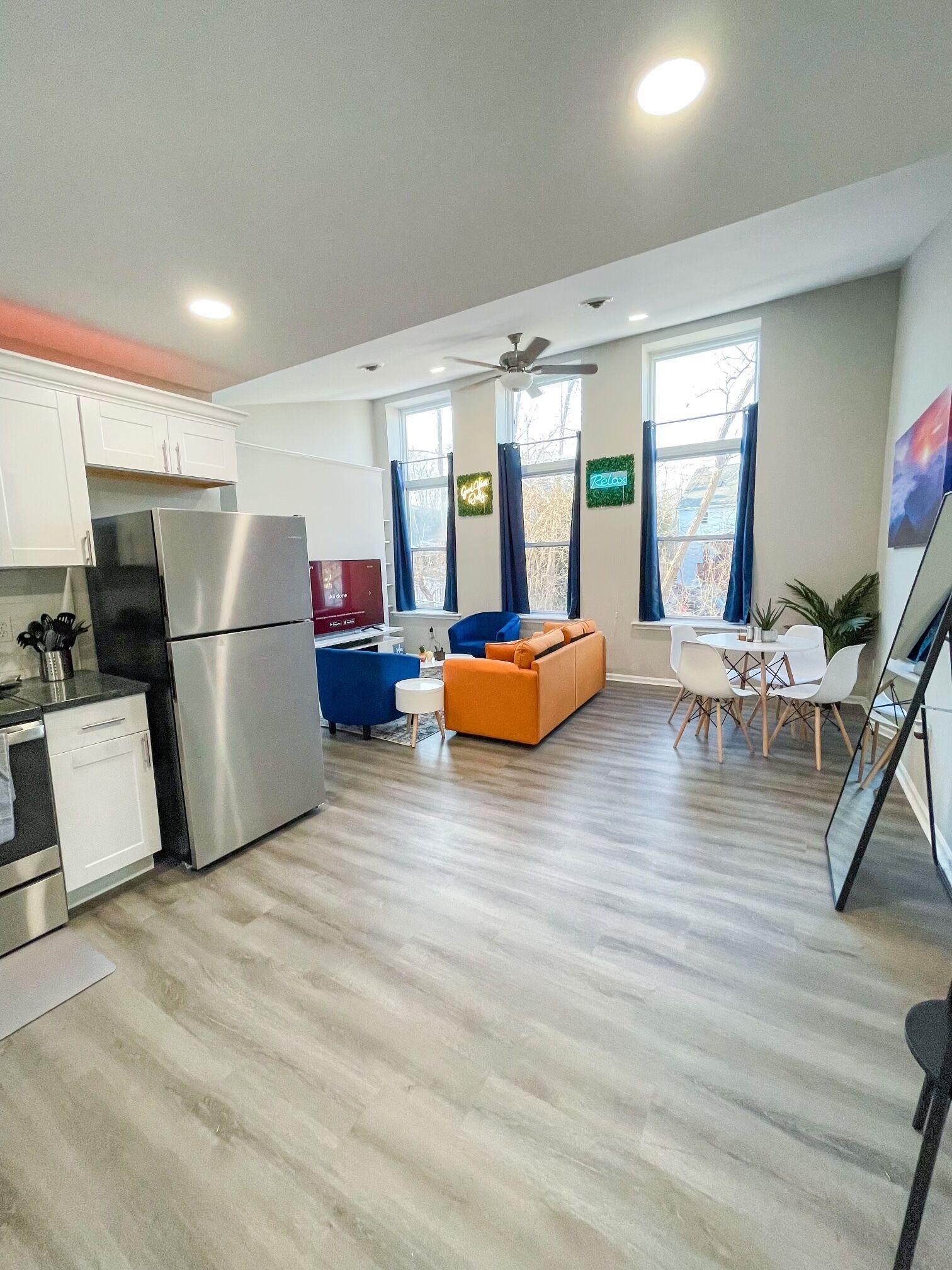 This stylish place to stay is perfect for a group of 4! It offers high ceiling's that give it a loft style feeling. The windows are about 10 feet high offering as much natural light as you can get!