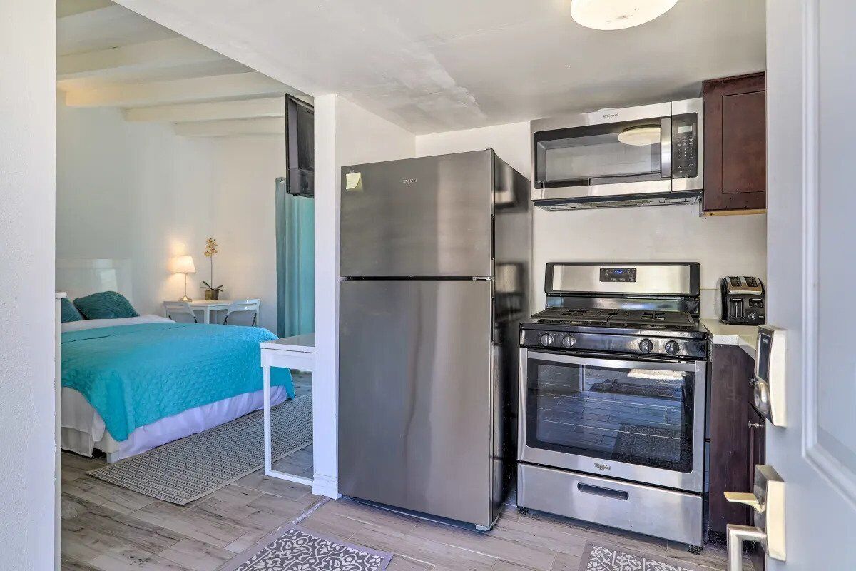 Well designed Studio apartment with the comfort of a king size bed and convince of a full kitchen and bathroom. Small patio outdoors perfect to sit outside and enjoy the view. Conveniently located for those wishing to visit desert attractions but stay in touch with local amenities. Professionally cleaned by hotel-trained staff. Easy access to both Joshua Tree and Palm Springs.
