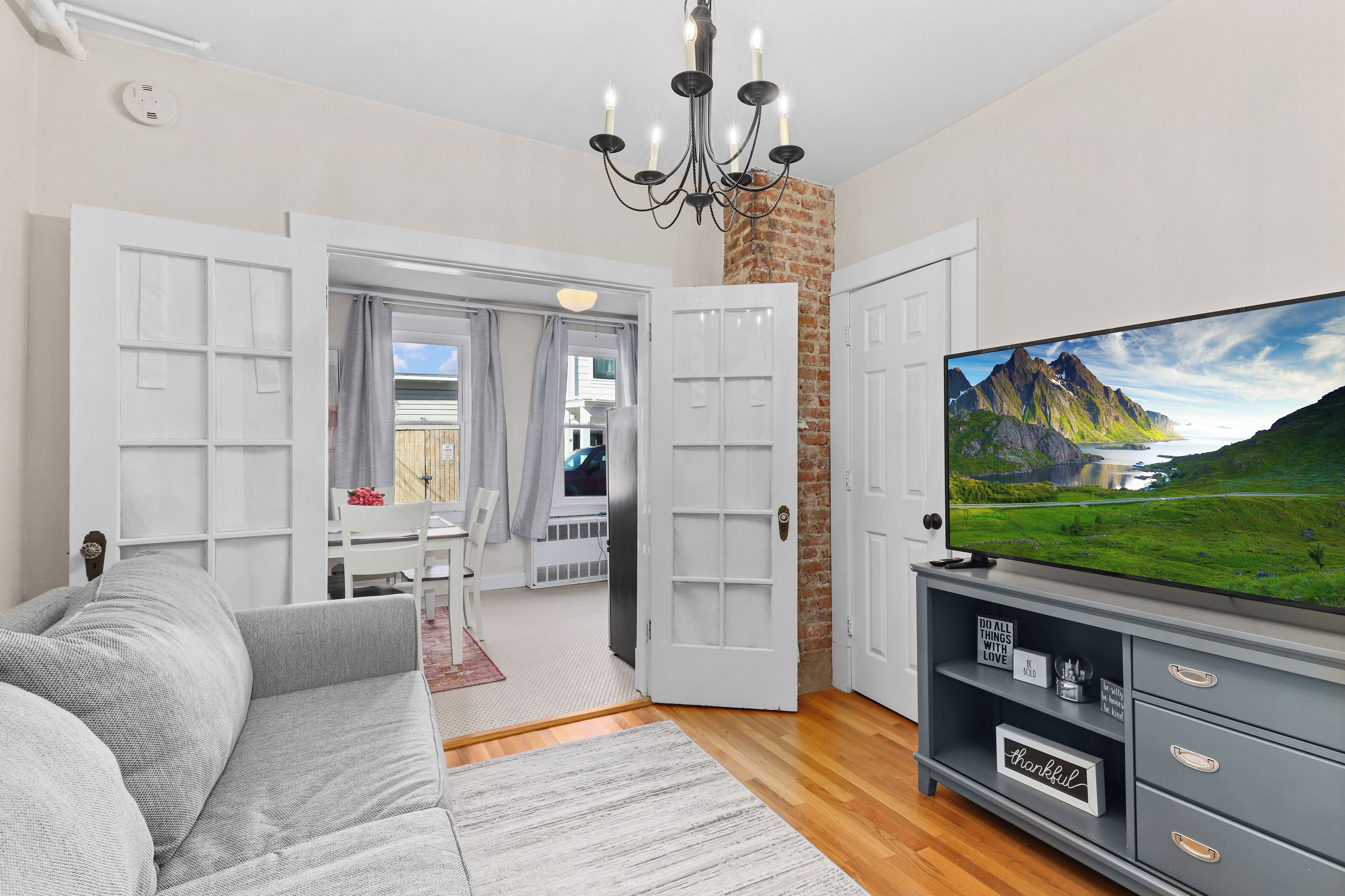 Take a short walk up the easy stairs and step directly into the open-concept living space, where a sleek, modern kitchen flows into a cozy living area with views of the Hudson River. The space is filled with natural light and features hardwood floors throughout.