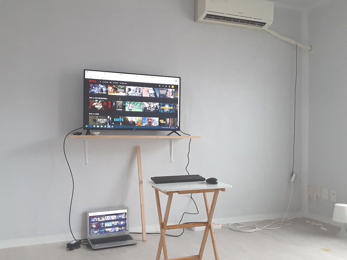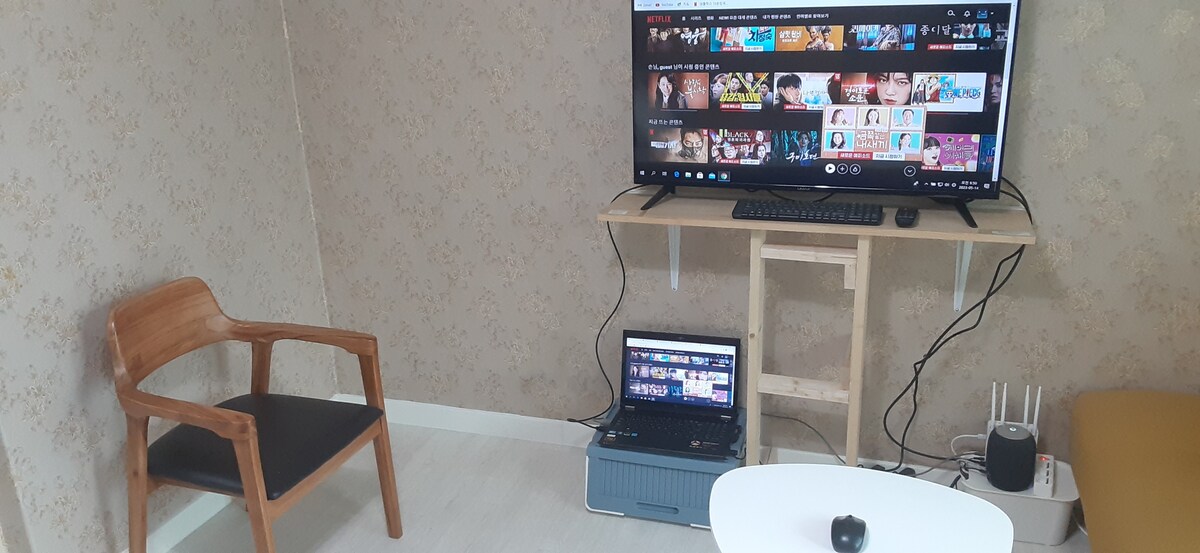 You can watch free Netflix movies and more with a 42-inch monitor connected to your laptop. I would greatly appreciate it if you could think of the pros and cons and make a reservation.