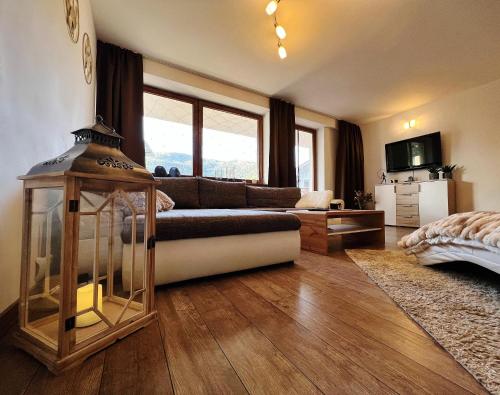 Apartmán Michell, Panorama Donovaly is located in Hanesy, just 15 miles from Vlkolinec Village and 23 miles from wooden church Hronsek UNESCO. This property offers access to a balcony, free private parking, and free Wifi. Offering a terrace with mountain views, this apartment also features a flat-screen TV, a well-equipped kitchen with a dishwasher, an oven, and a microwave, as well as 2 bathrooms with a shower and a hair dryer. There's also a seating area and a fireplace. During the colder months, guests can enjoy winter sports in the surrounding area. Water Park Bešeňová is 24 miles from the apartment. Poprad-Tatry Airport is 64 miles from the property.