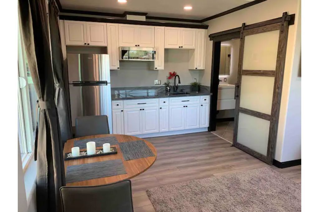 This studio includes a king size bed, new kitchen and shower, with a modern dining area with lots of great lighting.