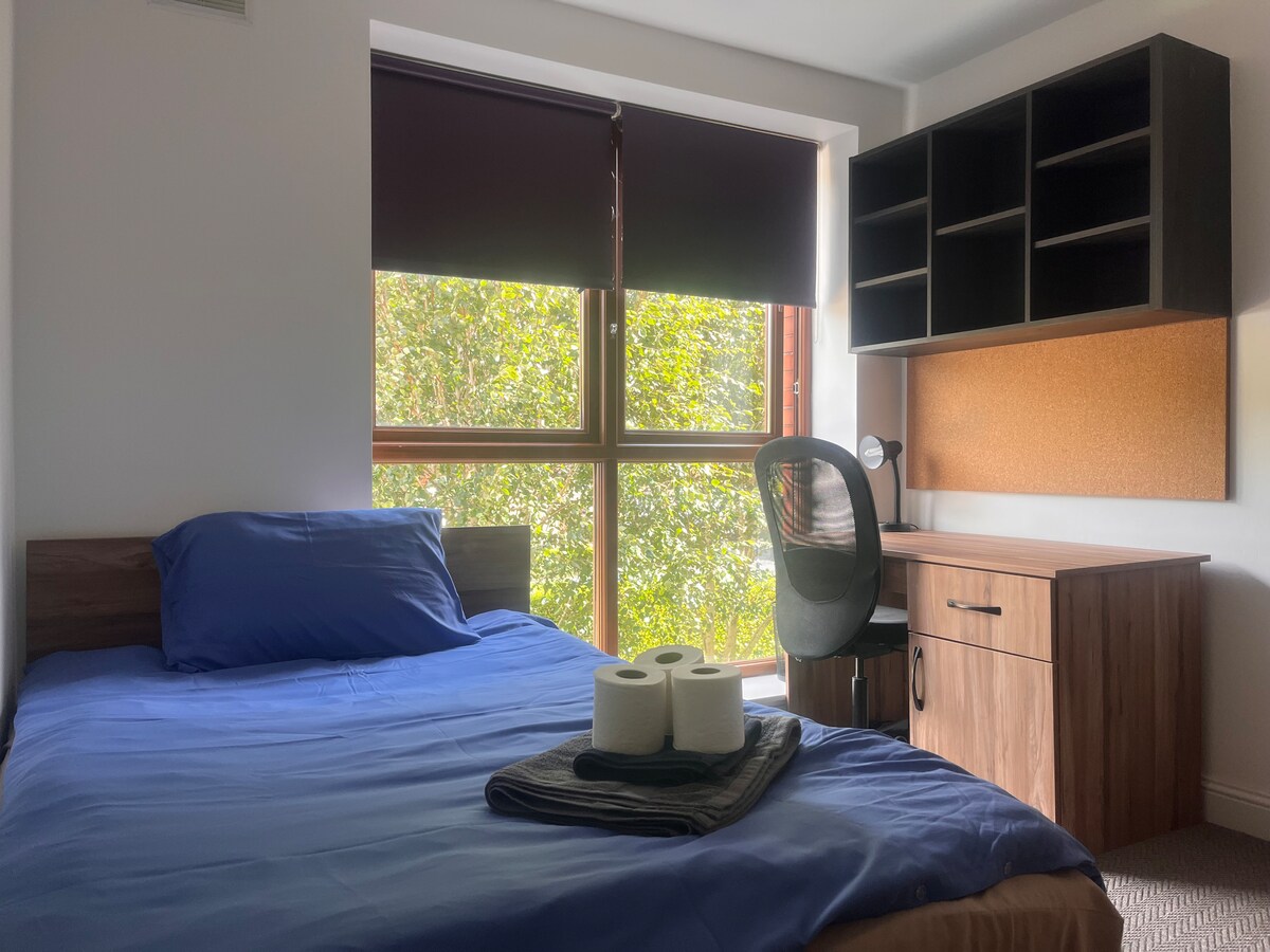 Each apartment has 4 single en-suite bedrooms and a shared kitchen. Each student has their own ensuite bedroom and would share the kitchen with up to 3 other people. The kitchen is fully furnished which would allow for the self-catered breakfasts. Internet connection is available. Our complex is very secure with one entry/exit site into the complex. This room is open to students only from 1st Sept to May 1st each year. However we can take non-student bookings during the summer months.