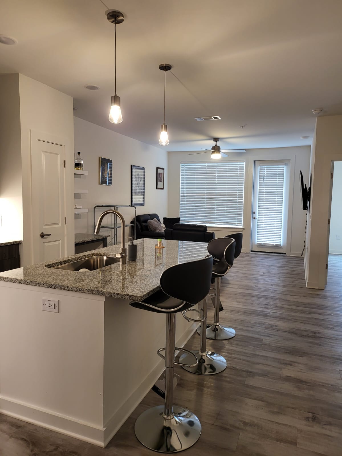 Spacious 1-bed unit in a modern building with elevator access. Features a full kitchen, comfy living room, and sleek bathroom. Guests enjoy a gym, movie room, pool table, and outdoor pool. Clean, quiet, and close to everything Duluth has to offer!