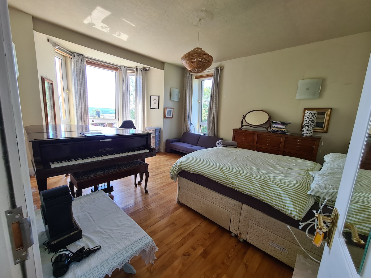 A large room for pianists overlooking the front garden with a double bed and 2 single sofa beds and a 1924 Bluthner piano. There are 4 large windows facing south east. It's spacious and sunny. Theres also the possibility of a camp bed for a fifth guest