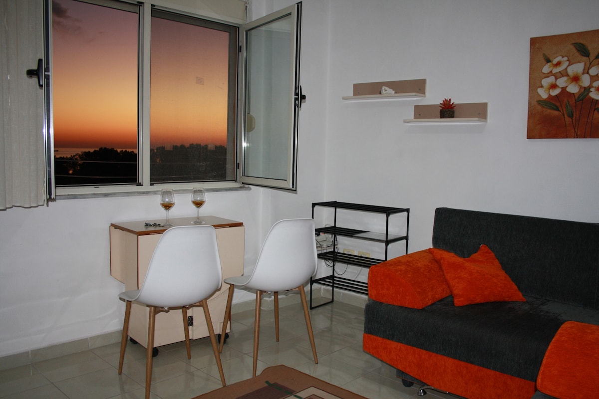 The studio is 30 m2 and is located in a new building with elevator and quiet area. It has a sea view with lots-of light, powerful wifi and is less than 1 minute far from beach. The studio is equipped with all the necessary kitchen amenities for the guests to cook.