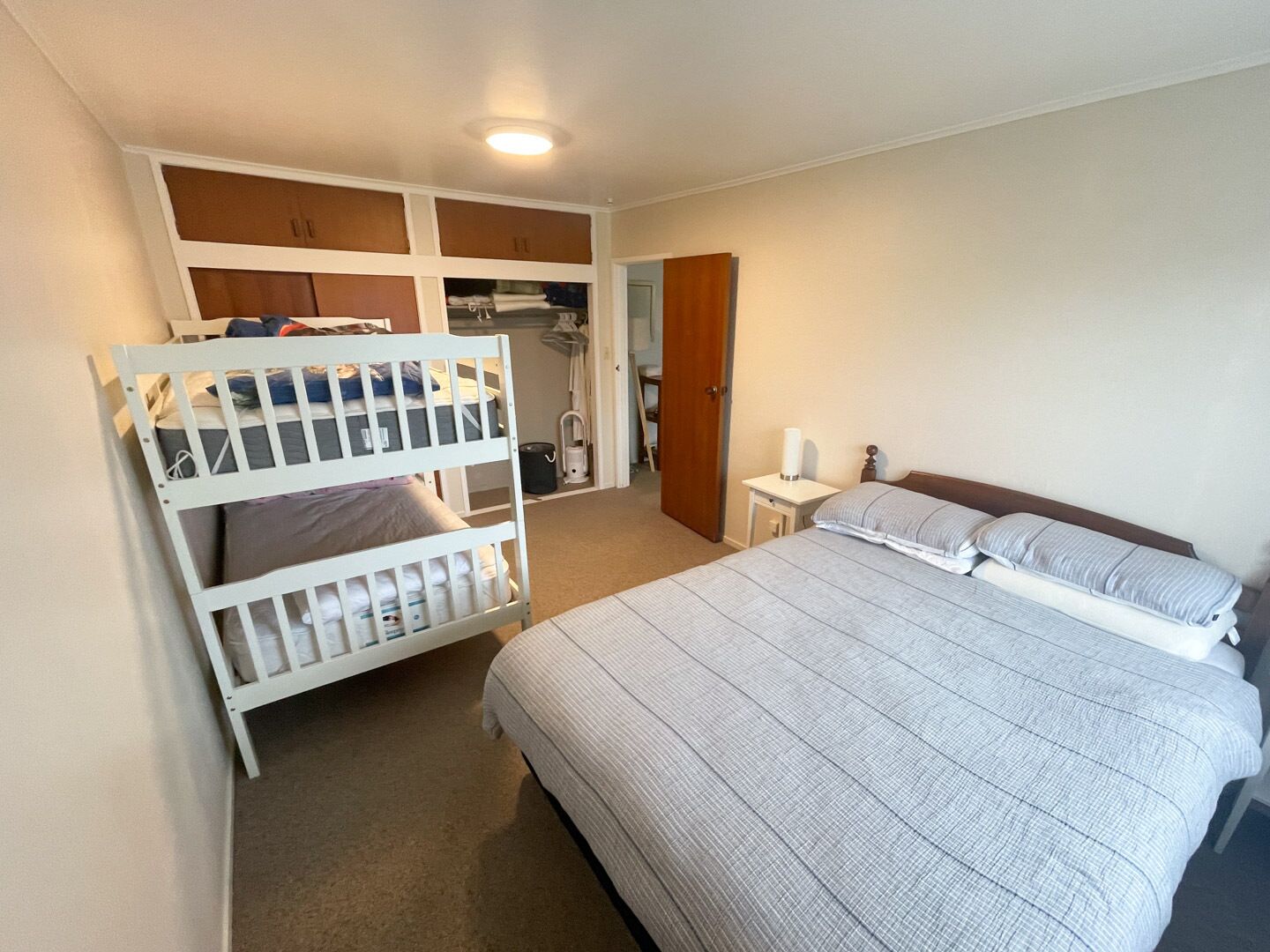 Self contained small flat, this space contains room for 6 people. Close to Ohope beach in a great location. Off street parking on grass for 2 cars. Cross the street and you're on the beach. Adventure central! Toi's walk or hop on down to the harbour for a paddle board, mountain bike the Burma track, or fish with your kids at the Harbour wharf. Please bring own linens for queen size bed, king single bunks and double sofa bed.