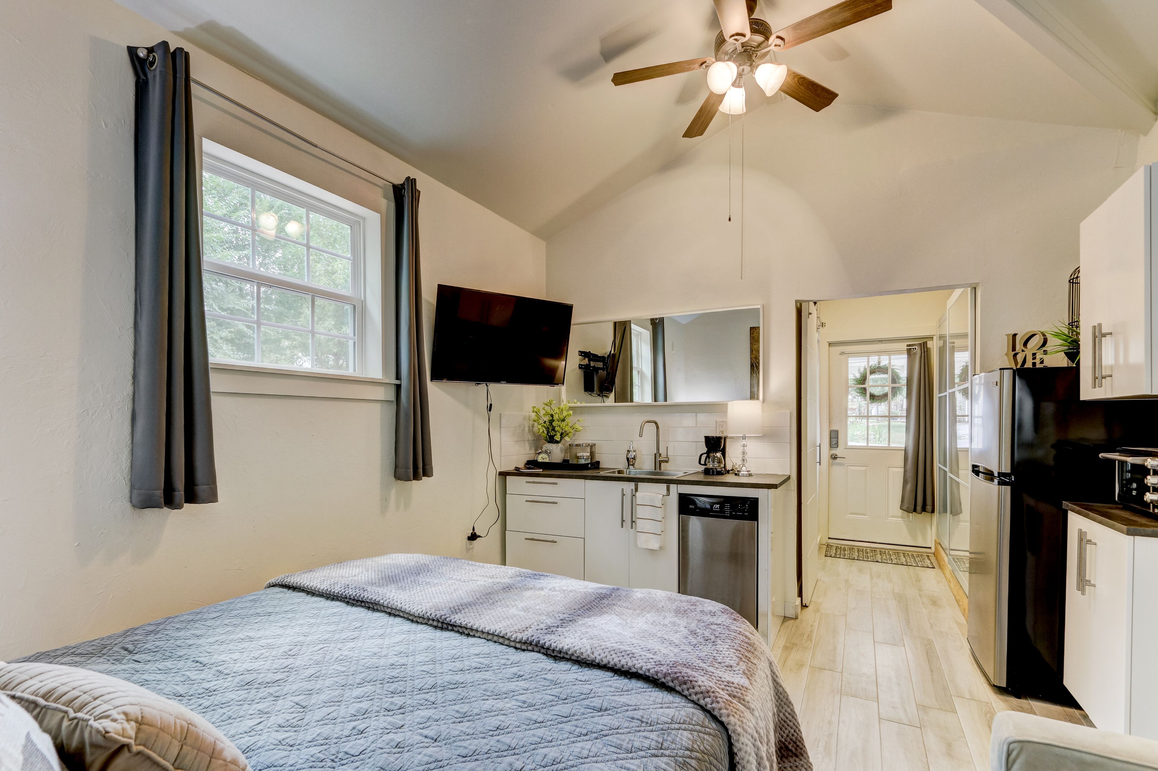 Keep it simple at this peaceful and centrally-located place. A studio apartment filled with everything you will need for your stay. The Cottage comes with a comfortable queen size bed, a dedicated working space, perfectly stocked kitchenette, a huge bathroom with a tub, a large TV mounted on a swivel so you can enjoy from the bed or the comfortable futon. Easily walk to many of Edmond's great restaurants or parks from The Cottage!