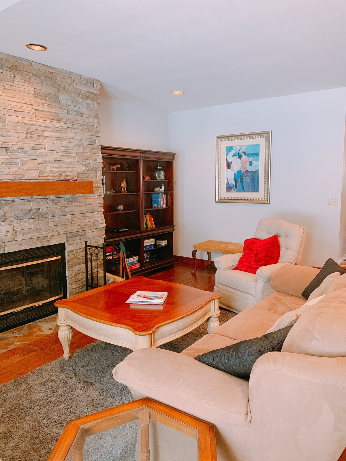 The apartment is located on the lower level of our home and is completely private. It has a queen bed in the bedroom and a very comfortable sofa in the living room. It also includes a fully-equipped kitchen, washer, dryer, and a Cuisinart coffee maker.