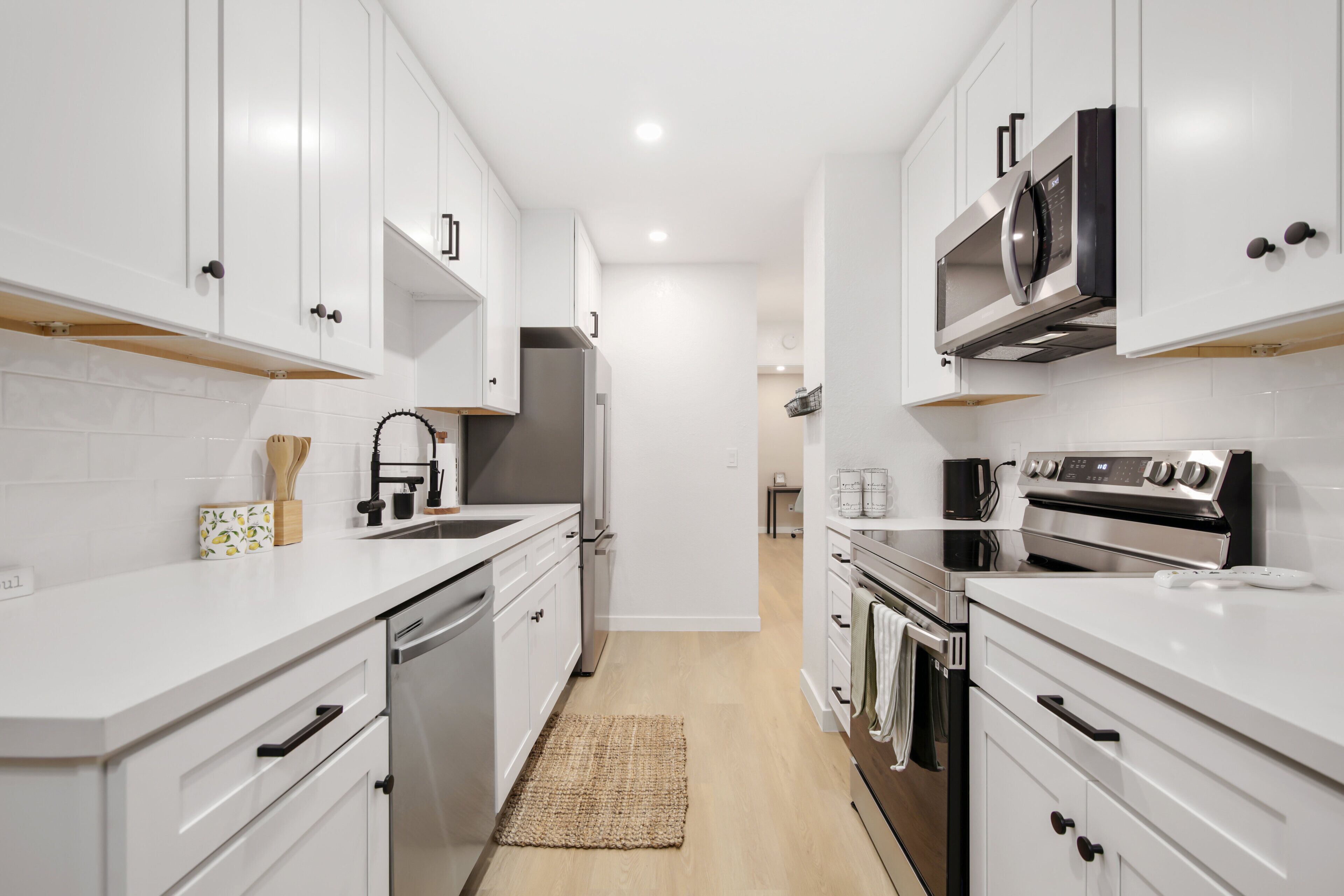 The single bedroom features a queen-sized bed with a brand new spring-coil mattress and high-quality bedding, a large closet, two nightstands, and two small cabinets to store your stuff. The sparkling bathroom is also stocked with towels, soap, shampoo & conditioner, has plenty of cabinets and storage, and has a Jacuzzi bathtub!
