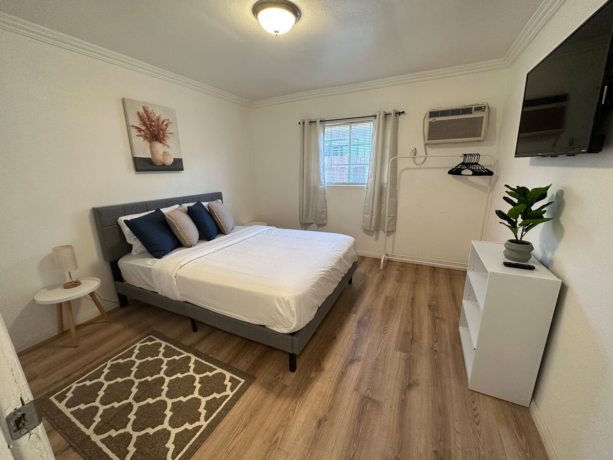 Modern, large, newly-remodeled 3 bedroom, 2 full bathroom apt. This is 1 of 2 units in a quite duplex. 1,000 sq feet! Very spacious. Brand new everything! Modern furnishings, Pottery Barn custom couch. 55 inch Smart TV in living room. 43 in Smart TV in master. Fenced yard. Rear of property features ally access to gated parking with remote control or street parking in the front. Shared laundry room onsite with Whirlpool W/D, free to use. Private patio