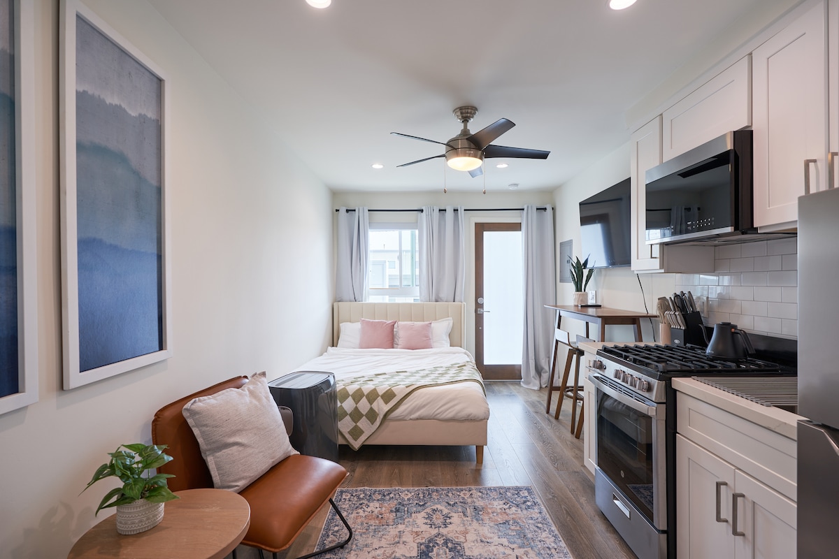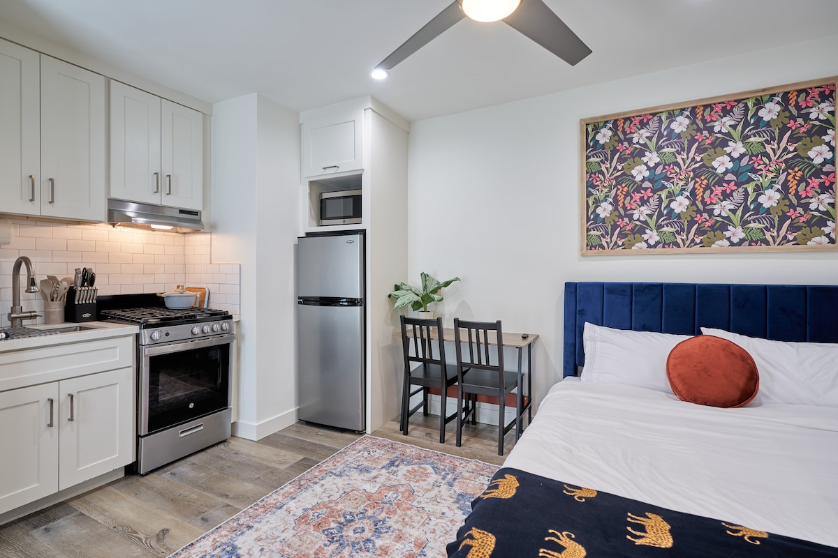 Unique mini-studio like no other: king bed with premium memory foam mattress, private entrance & bathroom, kitchenette with a Nespresso machine (hello latte art!), retro fridge, remote work friendly stand-up desk & 4K monitor, TV, quiet AC, spacious backyard!