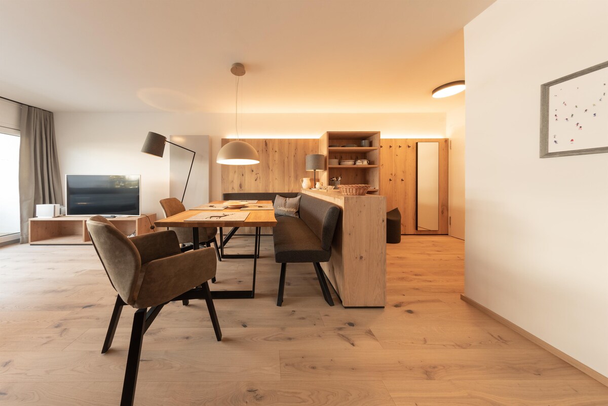 Eat-in kitchen with cozy dining area, microwave, electric stove, oven, dishwasher, cable flat-screen TV, radio, CD player, telephone, wireless Internet, safe, pull-out double sofa bed, bedroom with a spacious closet and desk, shower, WC, towels, bed and table linen, tea towels, ski storage with shoe heating, cot and high chair on request free of charge. All apartments have one or two large balconies and for each apartment is a garage space available for free.
