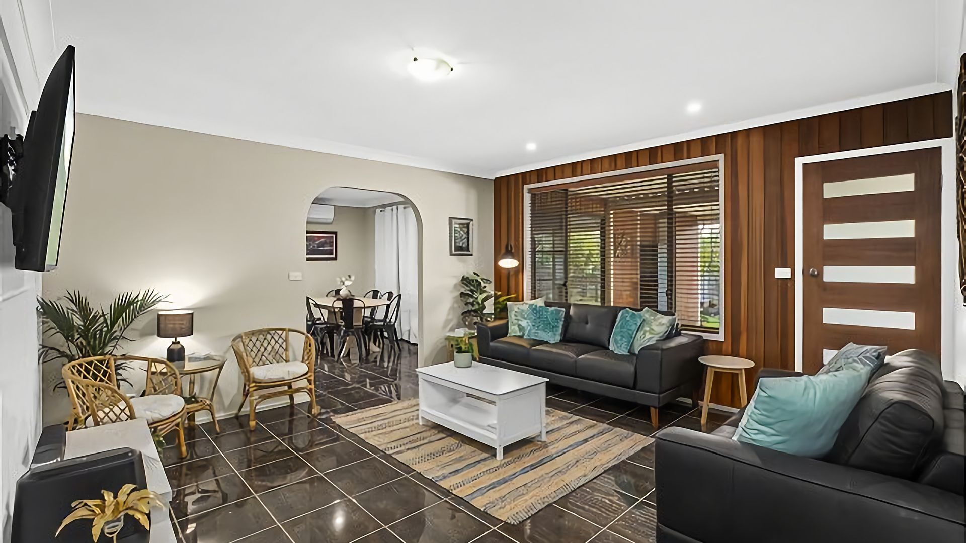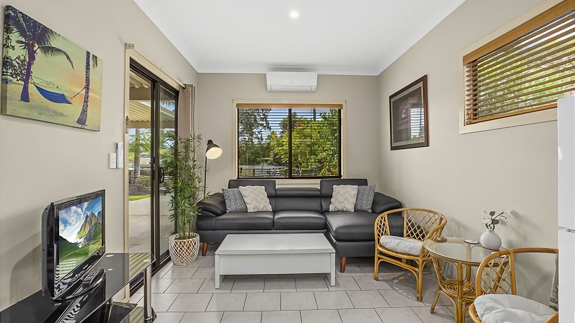 The living area opens up to your private undercover poolside area, so you can watch the kids in the pool. The living area has comfortable seating and a bean bag, as well as a large smart TV.