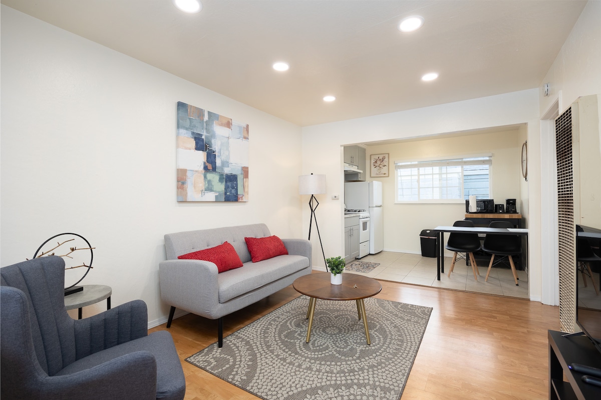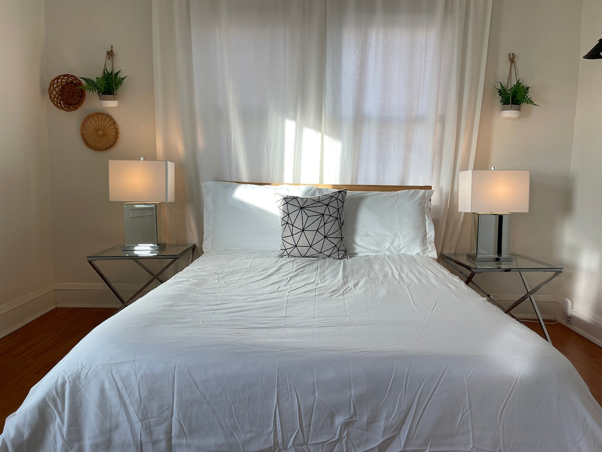 This quiet 1BR in a gated complex offers ample street parking, lush landscaping, a trellis with a picnic area, and coin laundry on-site. The unit features a comfy queen bed with plenty of natural light.