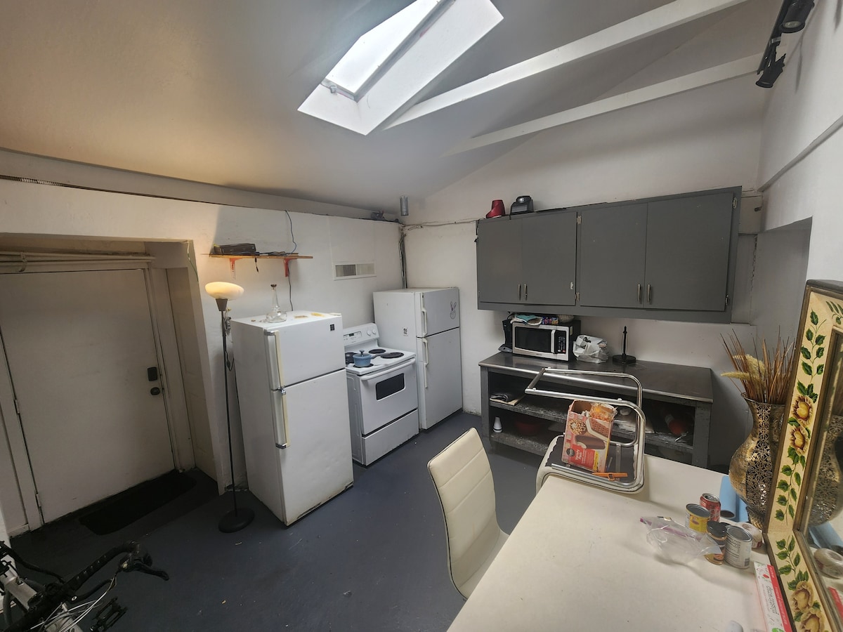 This rear facing unit is located in the ground floor below one unit and next to another. The apartment is equipped with a full size fridge, 4 burner gas stove, microwave, and toaster oven for light cooking.