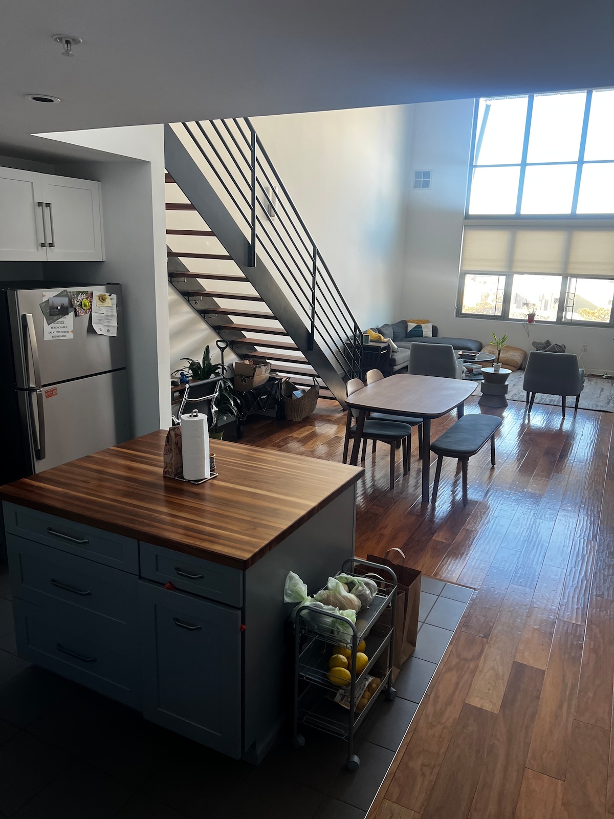 This front facing unit is located in the top floor above one unit and next to another. The apartment is equipped with a fridge, 2 burner induction stove, microwave, and toaster oven for light cooking.