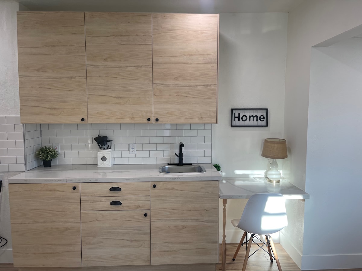 Gorgeous renovated studio with everything you need for your long term stay. Full kitchen for all your cooking needs stocked with pots pans, microwave, coffee maker, toaster, kettle and more. Nice desk for working from home along with strong wifi and a smart tv. Walking distance to a grocery store, shops, and restaurants. Easy street parking on our street.