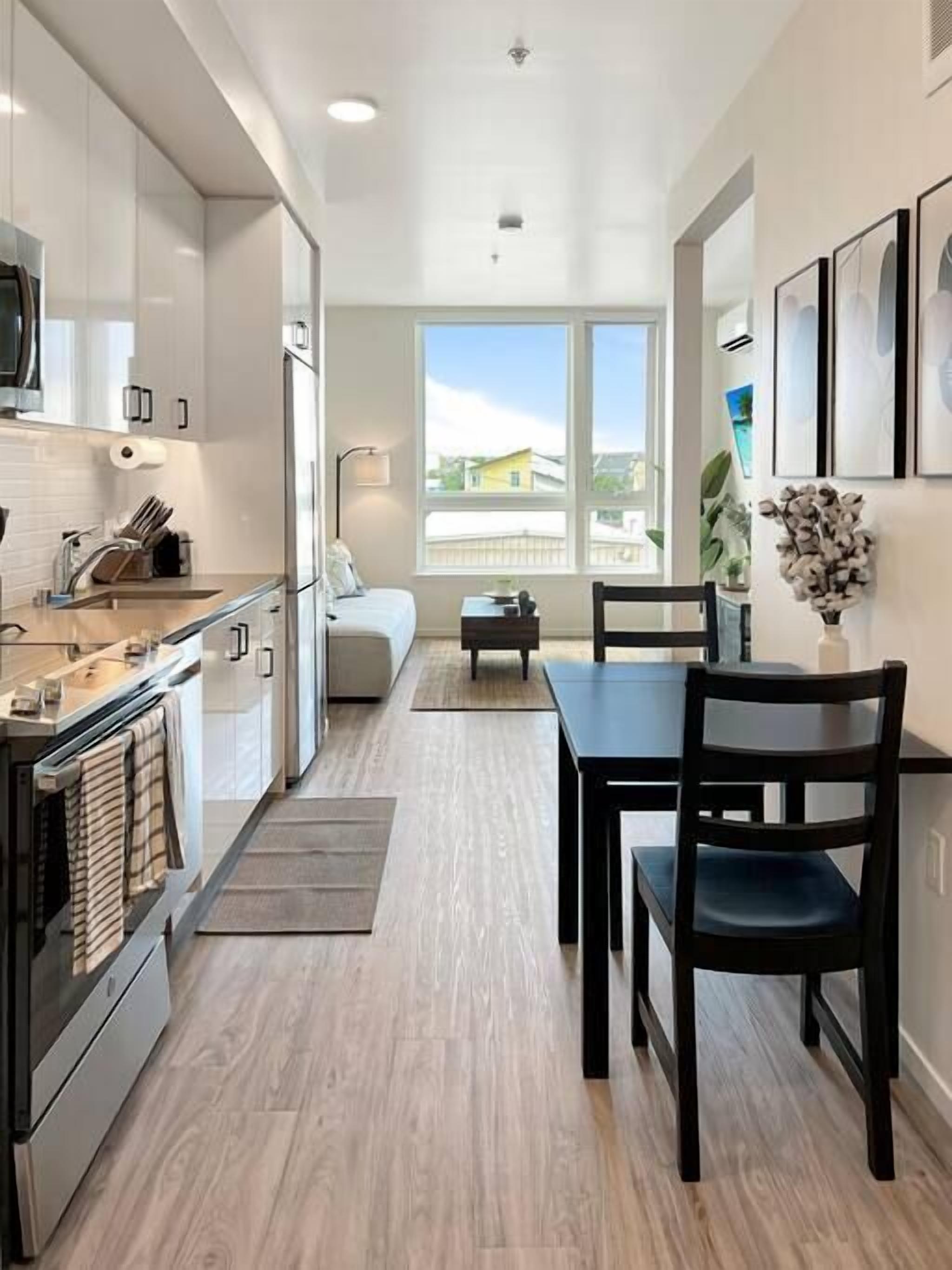 Enjoy a professionally staged designer experience at this fully renovated studio. We are walking distance from several restaurants a grocery store, shopping and a "ghost kitchen" Longfellow food hall just 3 blocks away and a grocery store is 6 blocks away. We have everything you need for a long term stay including pots pans cooking utensils and more.