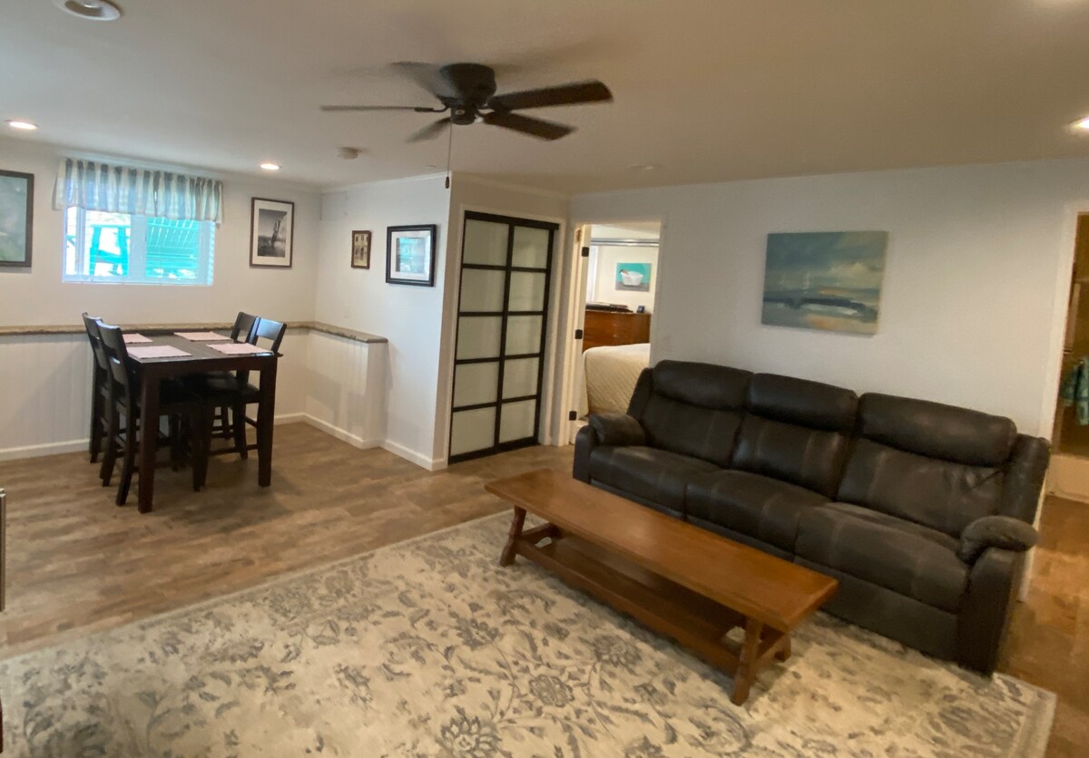 * The living room can also be used as a bedroom with a top-of-the-line Pottery Barn Queen-sized sofa/sleeper selected for a highest quality mattress and very comfortable cushions when used as a sofa. Bedding is included. The living room also includes an easy chair and ottomans along with one other upholstered chair PLUS a dining table for four people. There is lots of storage space beneath the television cabinet and a closet.