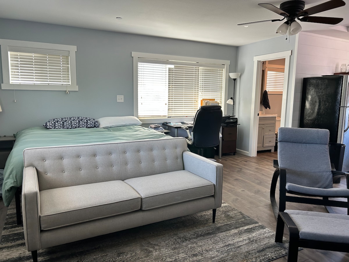 Welcome to Outsite San Diego - Encinitas Avocado! This cozy private room provides the perfect space for both relaxation and productivity. Inside, you'll find a comfortable queen-size bed, a dedicated workspace with a desk, and central A/C to keep you cool, along with a ceiling fan for extra comfort. The room features an open closet for easy storage, and your private bathroom, located just outside the room.