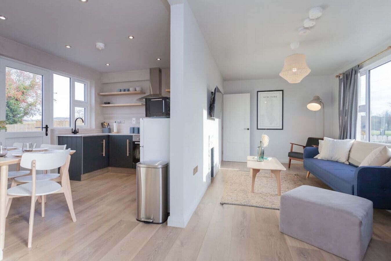 This bright and smart spaces feature an area for relaxing that has a sofa (which converts into a double bed) right opposite the 43-inch flat screen TV. There’s other seating and plenty of room to kick back and relax in the living room. Adjacent to this area is the kitchen/diner where there’s a table set for 4 and a modern fitted kitchen where you can cook for yourselves if you fancy doing that during your stay. There’s even a coffee maker and of course there’s a kettle, making it feel more like home.