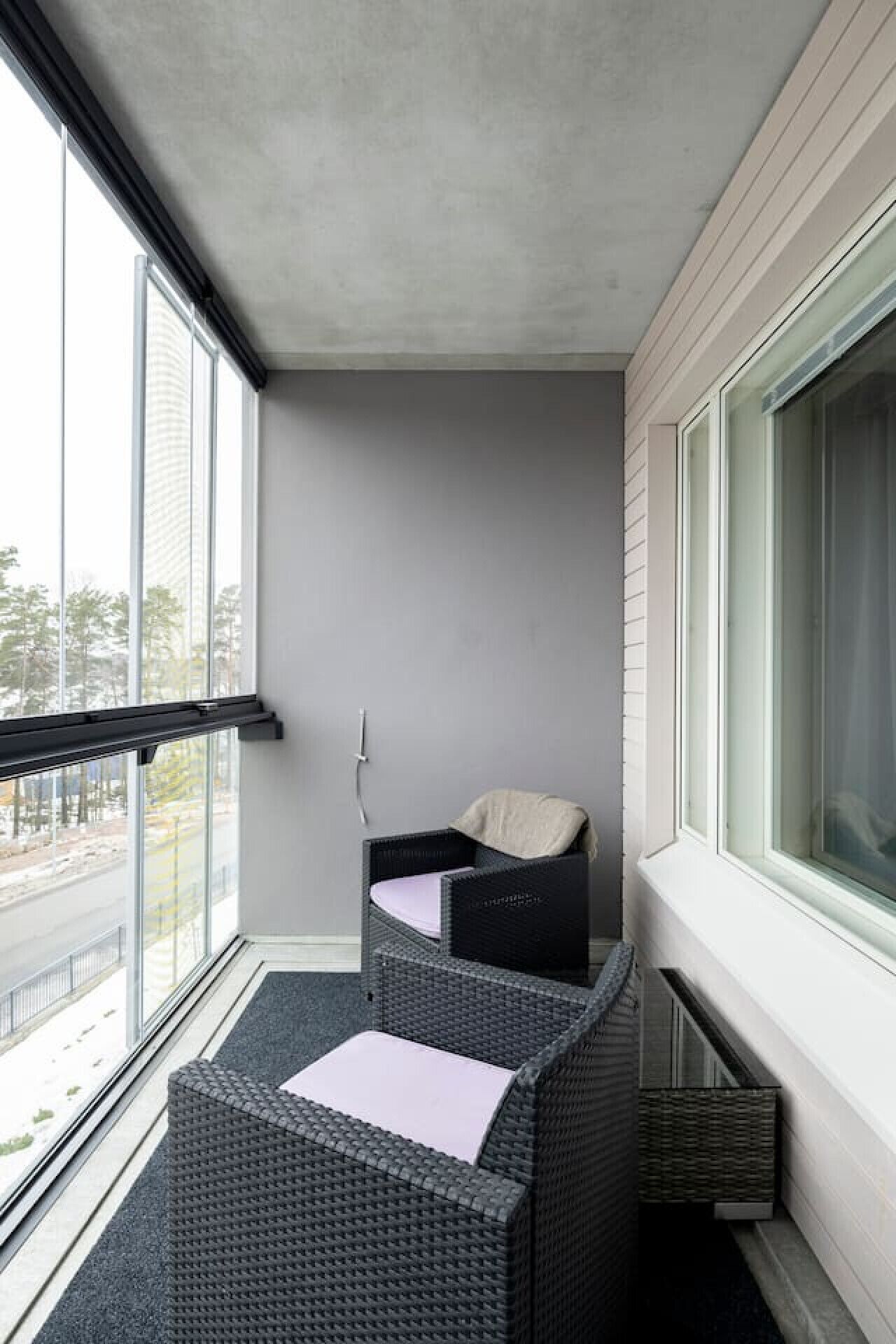 - glazed balcony with a view of the park