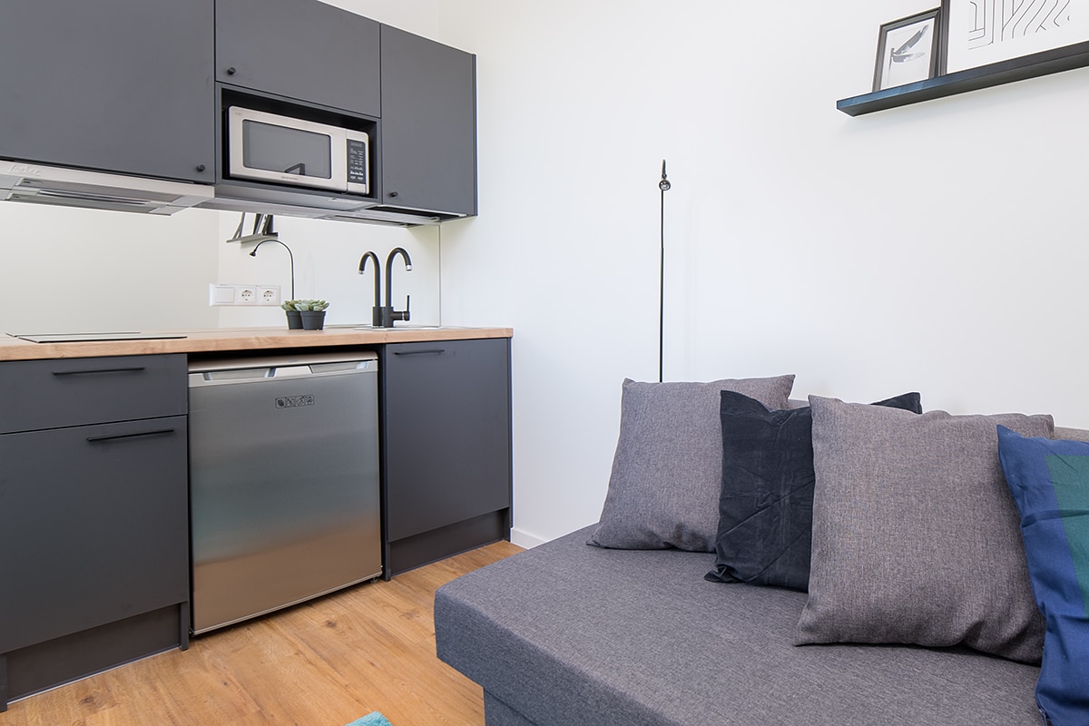 The space is a comfortable, all necessities included, studio apartment. The living space features a foldable bed, where two people can comfortably spend the night. You will have access to your personal fully equipped kitchen as well as personal bathroom with a shower. There is plenty of space to store your belongings and to ensure privacy, all windows have adjustable blinds.