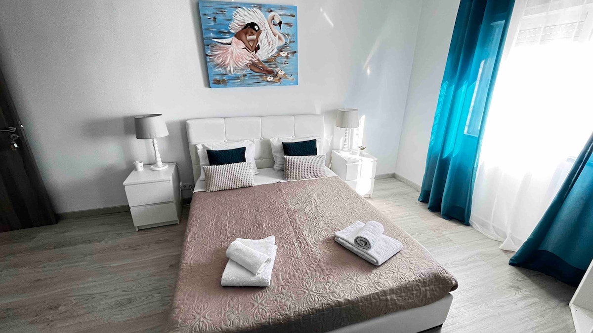 Located in the center of Faro, this modern apartment has a spaced room with a doubled bed and private bathroom, a fully equipped kitchen and a nice balcony.