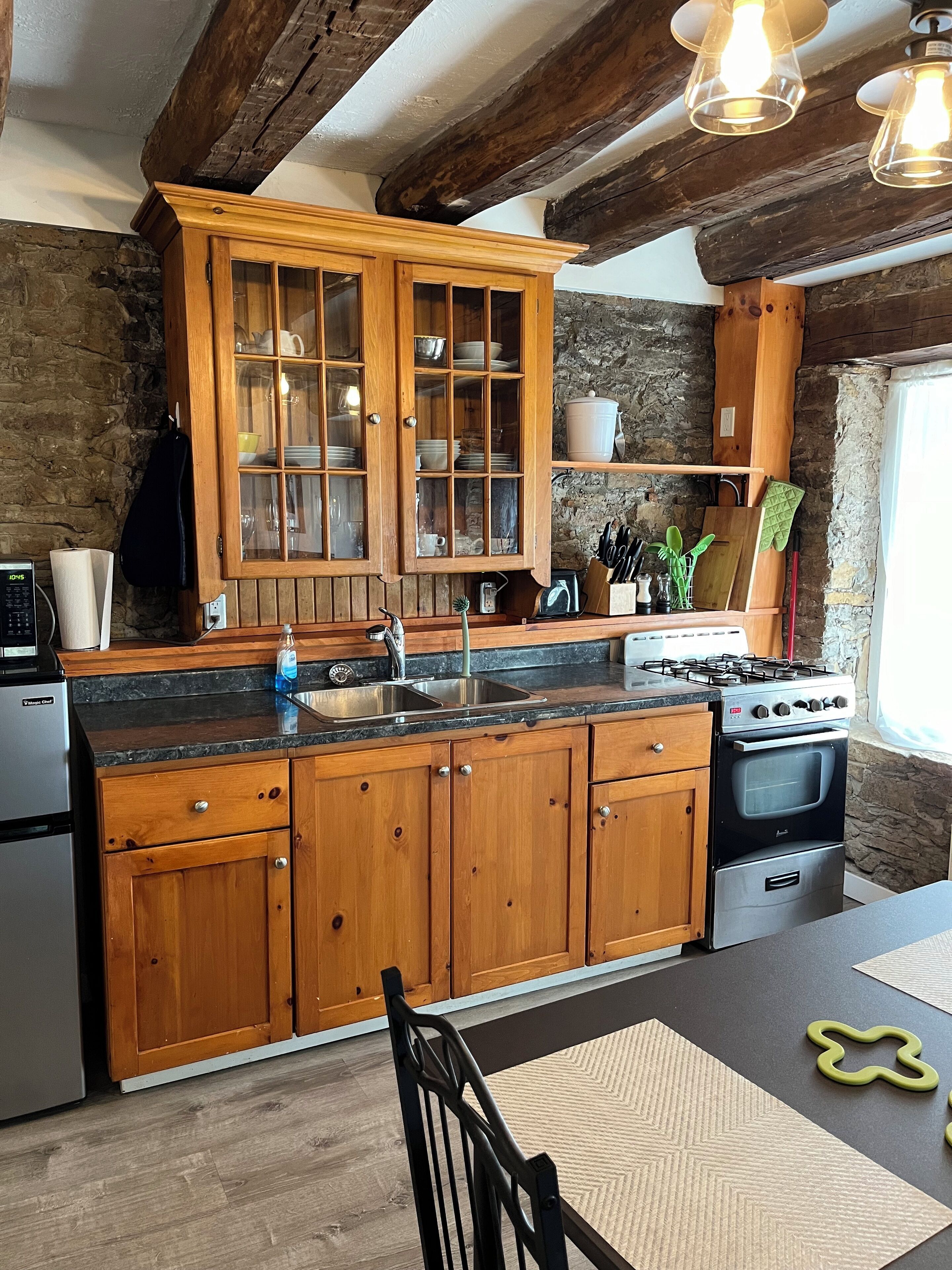 Built in 1867, our attached carriage house has been renovated into a studio apartment. It has a private bath, complete kitchen, sitting area, in-floor heat, coffee and tea. We are located 7 kms south of Elora, 10 kms west of Fergus and 15 kms north of Guelph in the hamlet of Ponsonby. The apartment has a king size bed and a smart TV. No Pets or Smoking. Longer term rentals are available at discounted prices. We have honey bees, chickens, pigeons and a dog named Penny on the property.