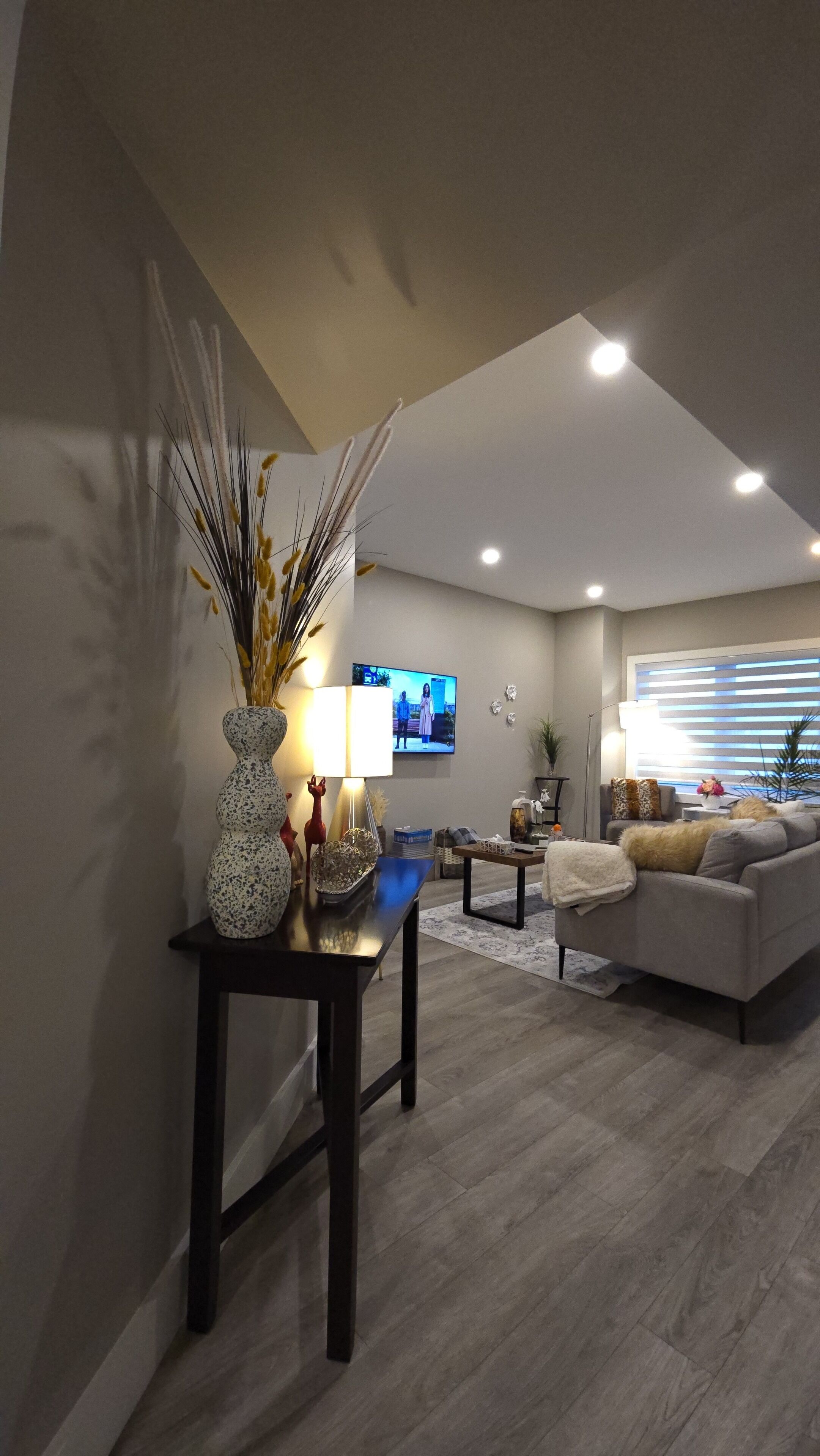 Our two-storey home is newly built (2024) with superior lament floors, 9 foot ceilings, large ceramic tiled walk in shower with glass doors, granite counter top and modern fixtures. In floor heat keeps you toasty warm. Everything you need for short or long term stays. A beautiful fully furnished apartment , private entrance, kitchen equipment and covered patio to make your long term stay enjoyable.