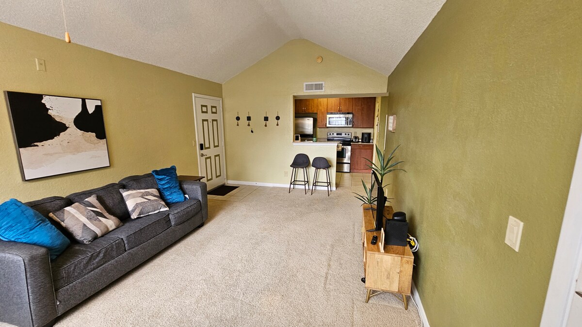 This is a spacious, bohemian inspired, 2 bedroom 2 bath, with 2 king beds, on the bottom floor of a duplex. Two roll away beds makes it a 6 sleeper.