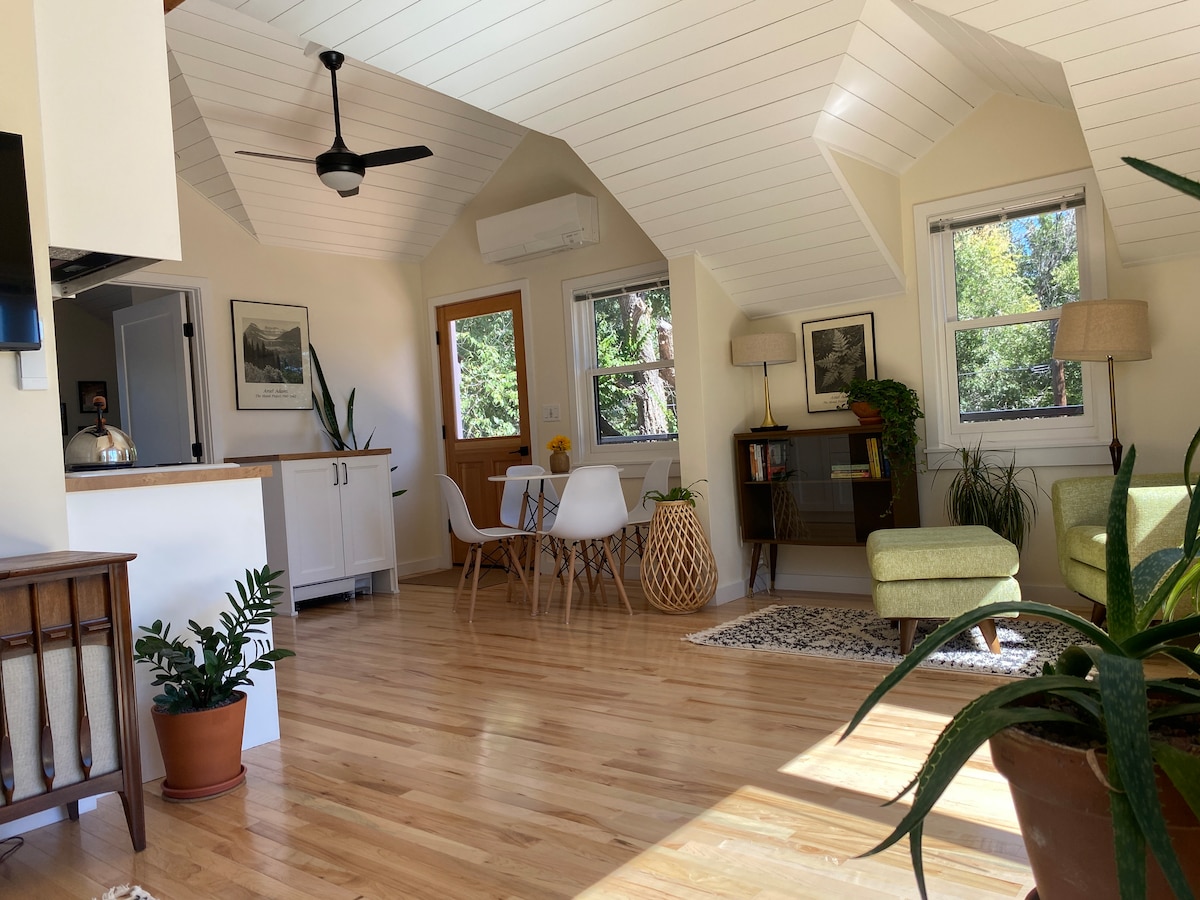 You will have the entire upper unit of this newly built carriage house at the end of a large lot in Old Town Fort Collins. The apartment has a large open living area with cathedral ceilings and hardwood floors. The furniture is a combination of original mid century pieces and new items from high end furniture companies. The kitchen has an electric range, refrigerator, microwave, dishwasher, and appliances including blender, toaster, convectional/air fryer combo, and a fully stocked kitchen. The bedroom has one queen bed, a work area, and a reading nook. The bathroom is off the bedroom and has a glassed in shower and backlit vanity mirror. A laundry room/closet with a washer/dryer combo is located in the bedroom. The living room couch is a Joybird pull out with a single mattress. The entire upper deck, nearly 300 sf, is yours to enjoy.