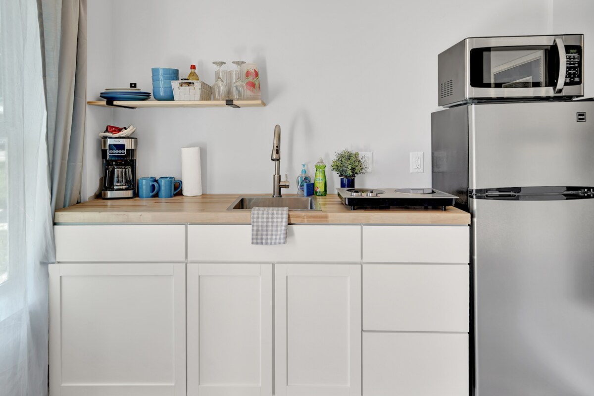 Next, stroll through the kitchen area, which features an electric cooktop (no oven), a dishwasher, a large fridge with plenty of room for food and drinks, and a kitchen sink. The kitchen is loaded with silverware, cups, plates, pots and pans, and everything else you need to make your stay unforgettable.