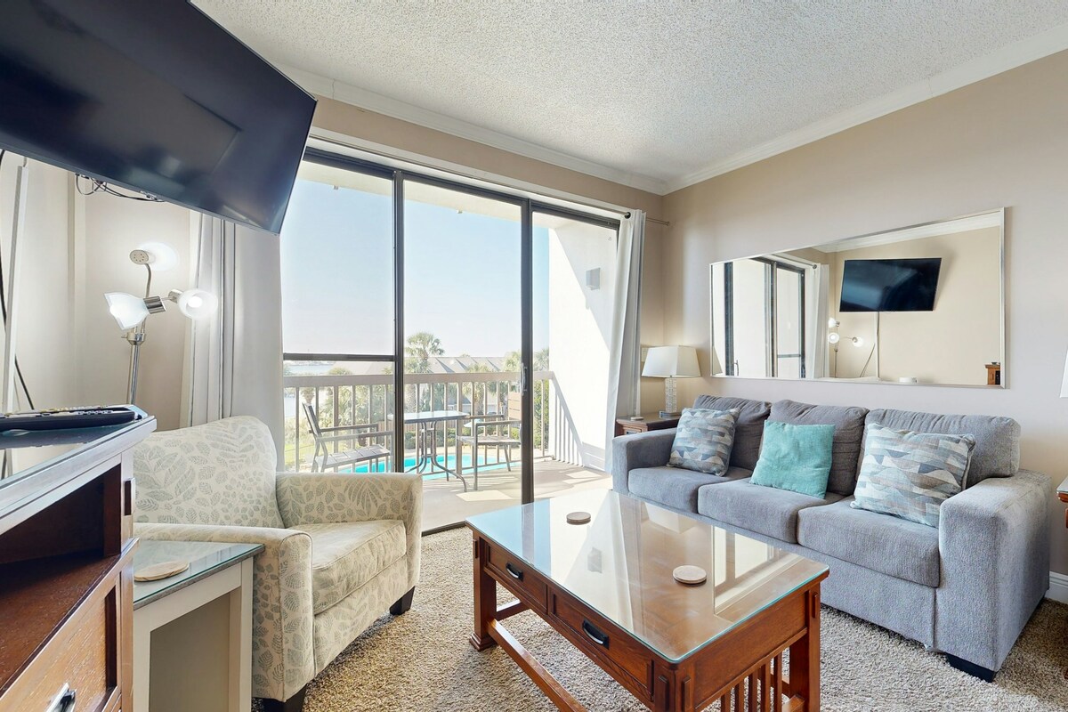 Plan for a romantic getaway or a little alone time at this cozy, third-floor efficiency. In the mornings, brew up your morning coffee and whip up some breakfast in the kitchenette and then sit out on your private balcony to watch the sound wake up. You will also enjoy access to the Pirates' Bay complex pool, private, bayfront beach, a shared grilling and picnic area for fun dockside cookout.