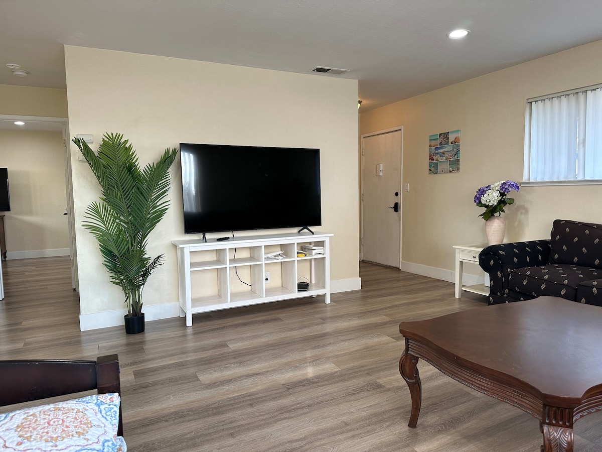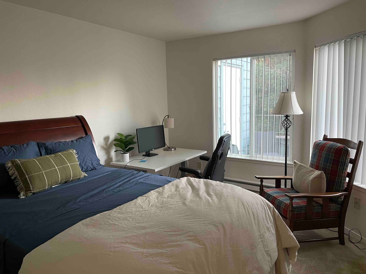 This is 2 bedrooms apartment in a four flex. It’s an upstairs unit. A lot of sunshine and open area. There is an extra twin bed in the living room. The place is close to shopping area, easy freeway access…