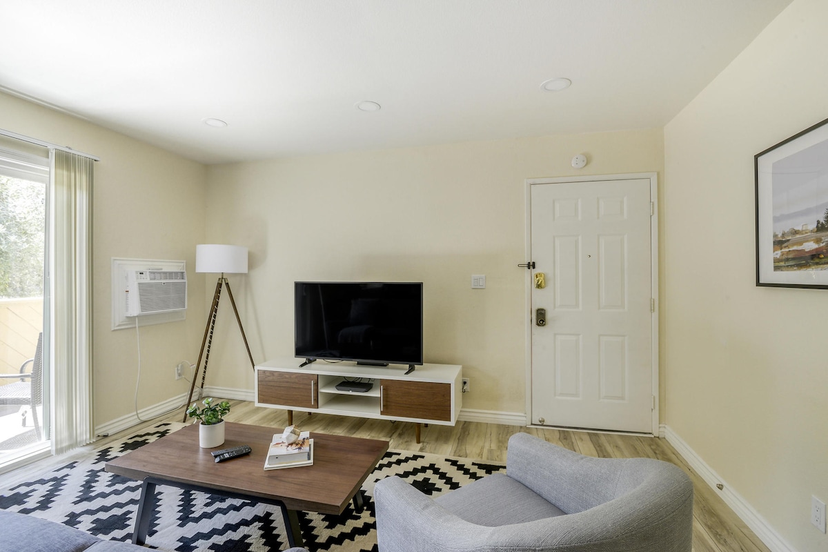 Spacious living room includes a comfy sectional sofa, private patio with outdoor furniture, on-site laundry, high-speed Wi-Fi, on-site parking, and keyless access.