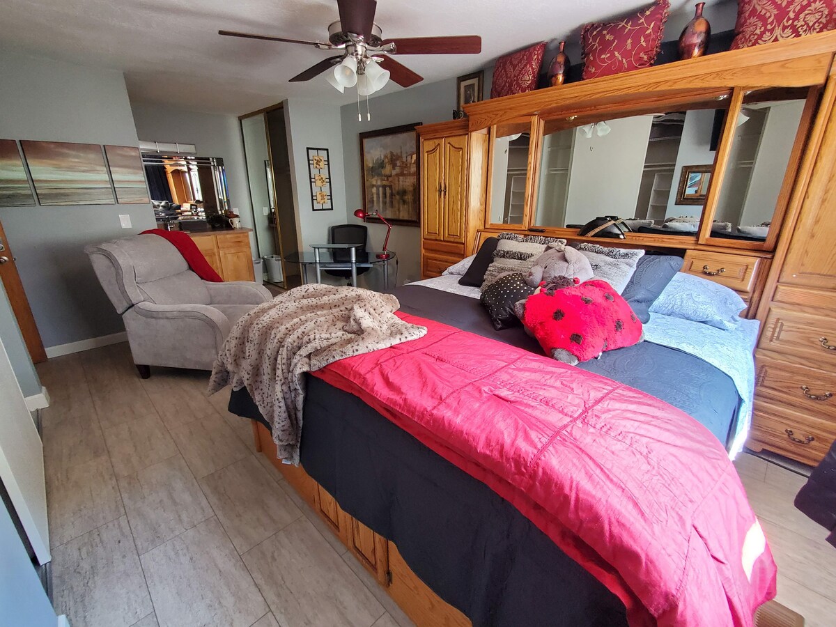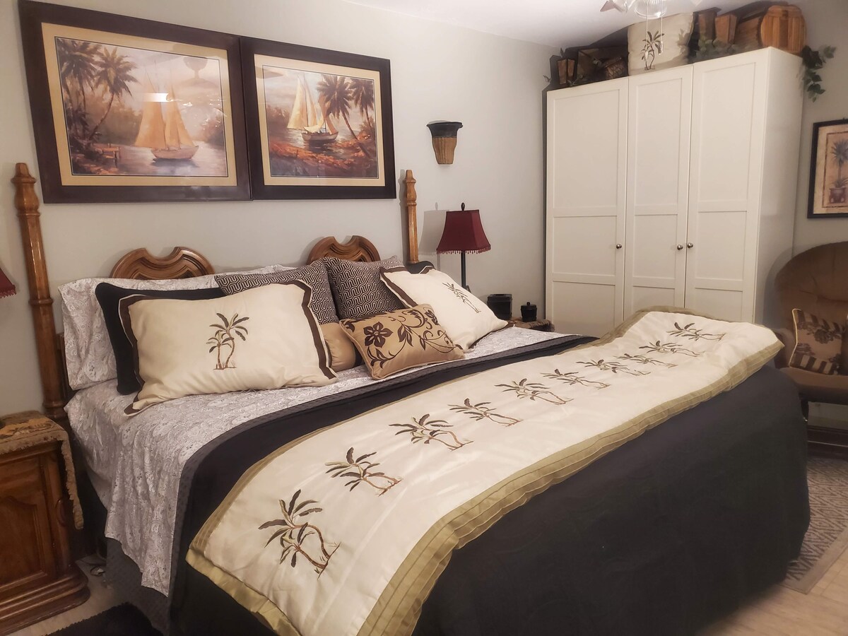 The unit is on the second floor with a private deck and entrance available. Your room is the master suite, with an en-suite private bathroom, one of four bedrooms, all Airbnb rentals, no host lives on site. The bathroom has a stall shower with glass door. This cozy bedroom has a comfortable king size bed with a memory foam mattress with plenty of storage space for your belongings.