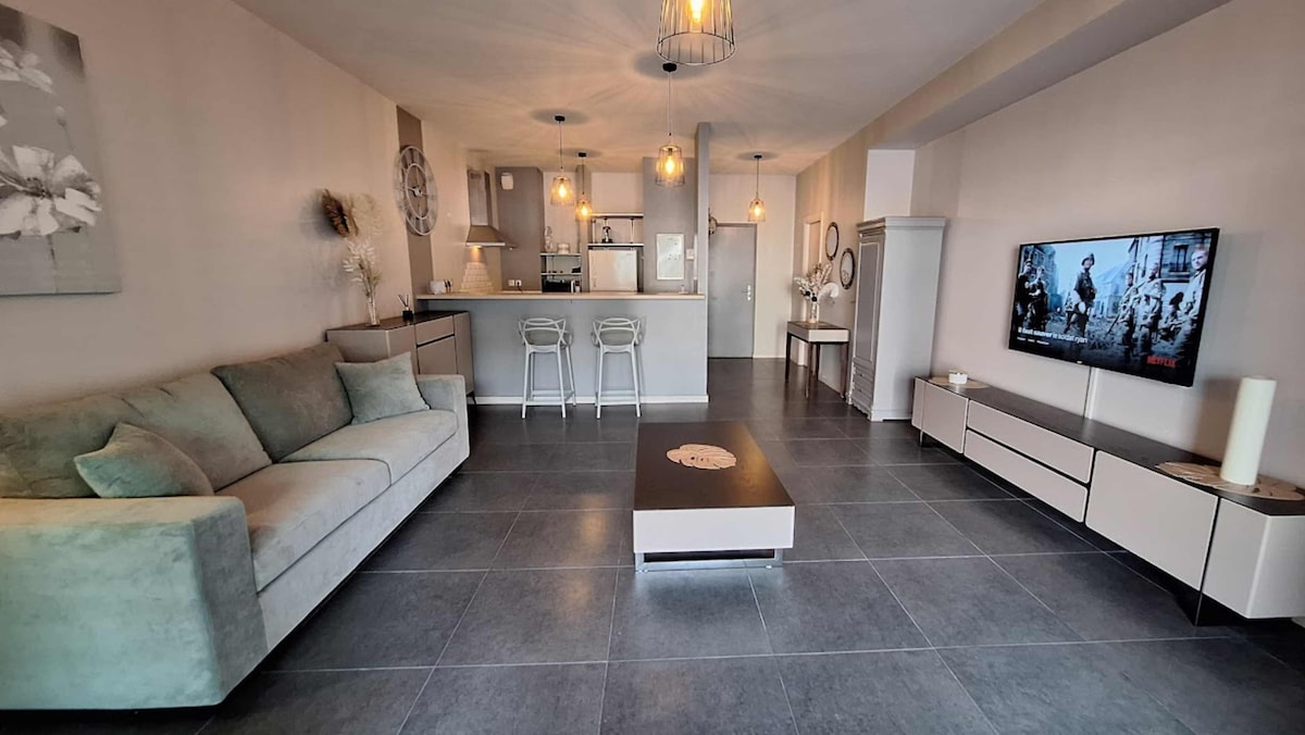 - A spacious living room, with a large sofa to relax after your day of activities and a large TV connected with Netflix. A large American kitchen fully equipped to prepare good meals and a Nespresso coffee machine for your morning coffee.
