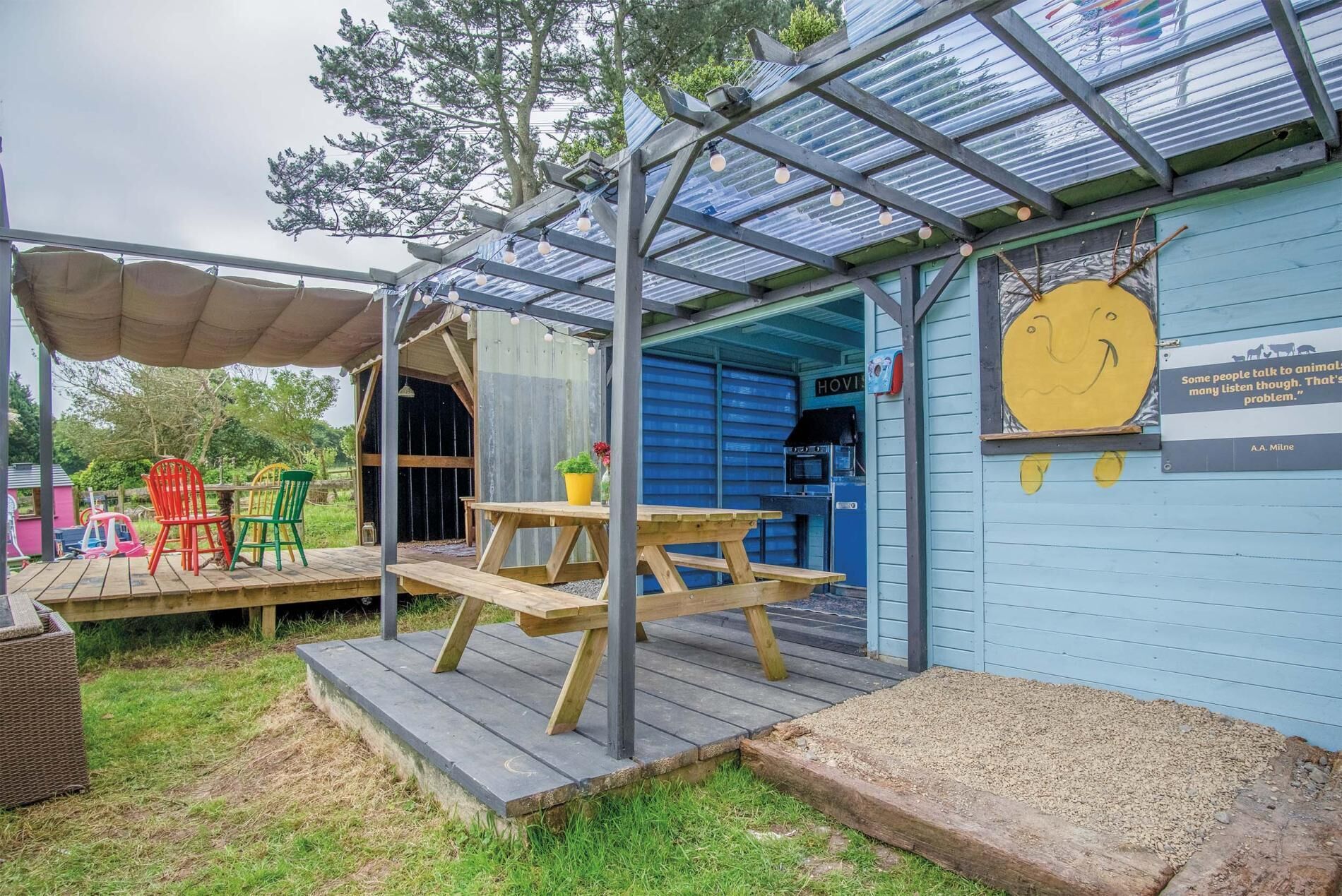 Greenfields beckons with a shared outdoor kitchen equipped with a small oven/grill, microwave, full-size fridge, and tea/coffee amenities. Unwind in the gentleman's lounge adorned with a plush Chesterfield sofa, captivating artwork, and an array of board games. Little ones will delight in the children's play area, brimming with toys to spark their imagination. Fresh for 2024, the newly installed communal toilet and shower room feature a spacious walk-in shower and toilet and separate toilet facilities, ensuring your comfort during your stay. Greenfields is also set up to be an Autism friendly site.