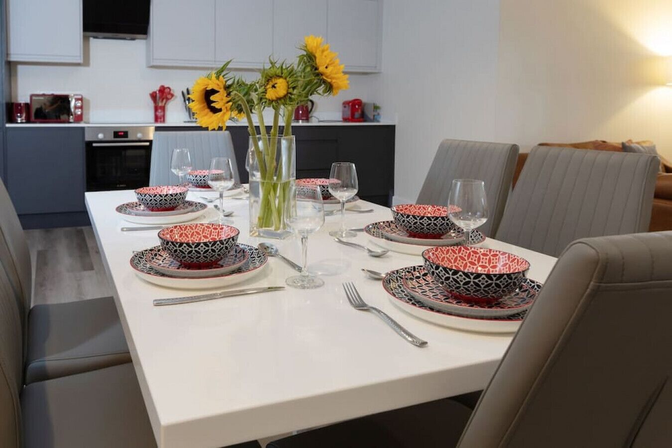 The open-plan living area includes the kitchen and the lounge that will comfortably seat all of you for a movie night in front of the large Smart TV.