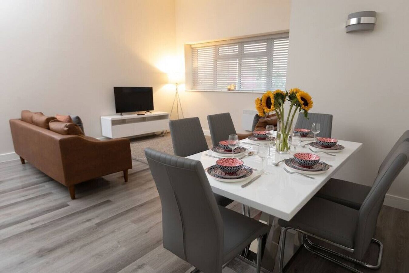 The modern, white gloss kitchen has a large dining table and chairs, an electric Aga, microwave, fridge, and dishwasher and is well equipped to help you self-cater with ease.