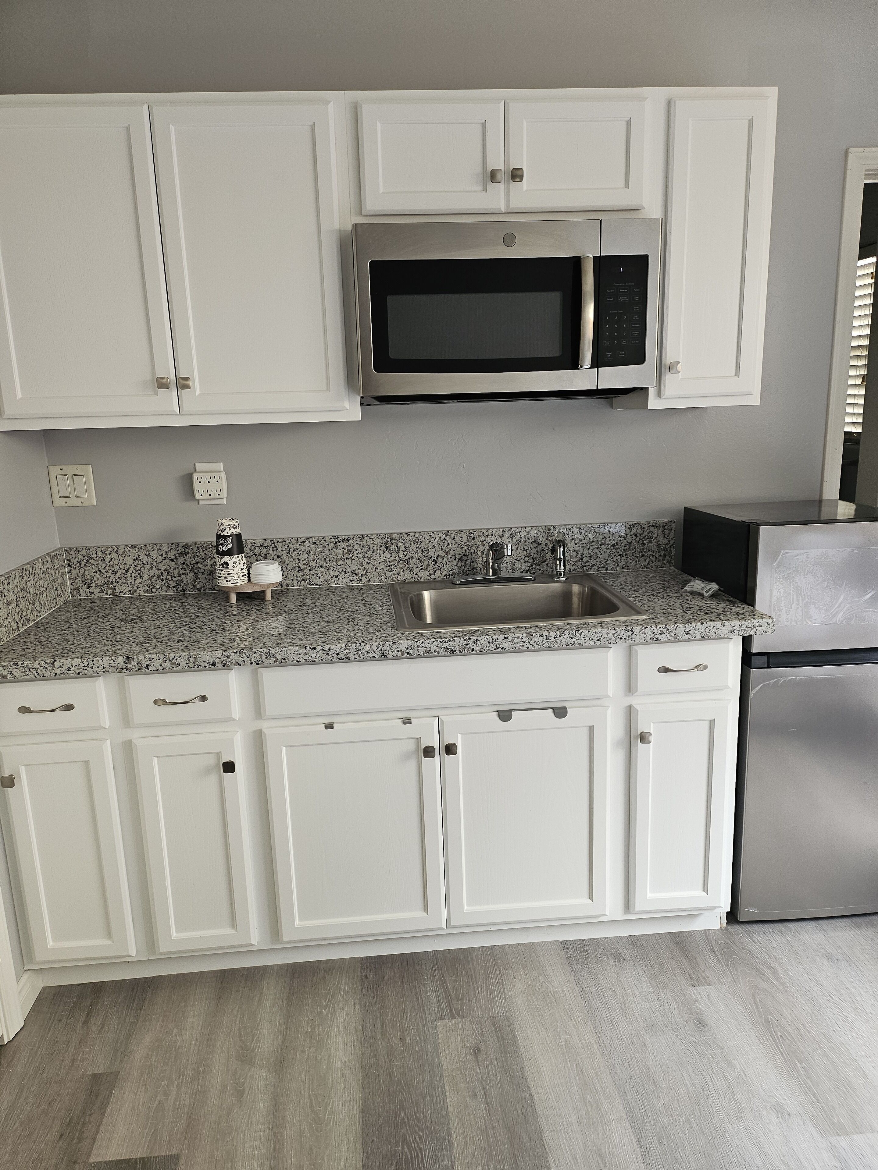 The kitchenette includes an electric pot, microwave, coffee maker, fridge, sink, counter space, dishes and supplies. There is also a cutting board, seasonings, and a large free-standing George Foreman grill outside the door.