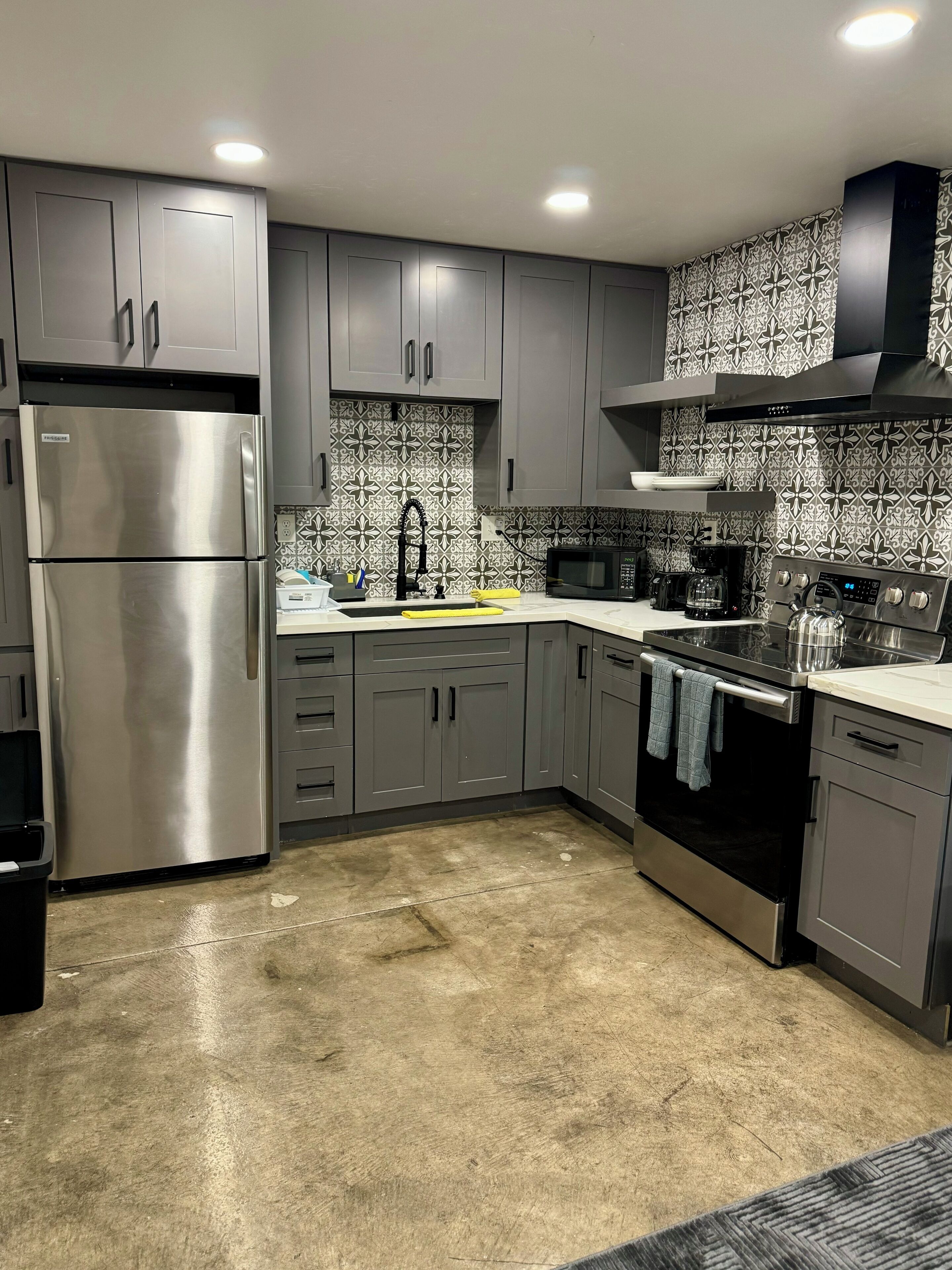 KITCHEN: Refrigerator, cooktop, microwave, extra large toaster oven, dishwasher, drip coffee maker, instant hot water maker, pots, pans, & cooking utensils, kitchen basics, instant pot, spices, Berkey water filtration unit