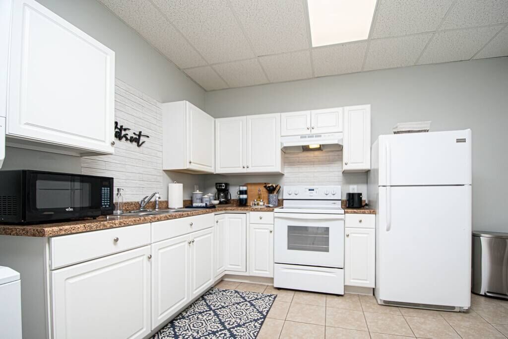 KITCHEN: Fridge, stove/oven, microwave, cooking basics, drip & Keurig coffee makers, toaster, kettle, island w/ seating, paper towels/trash bags